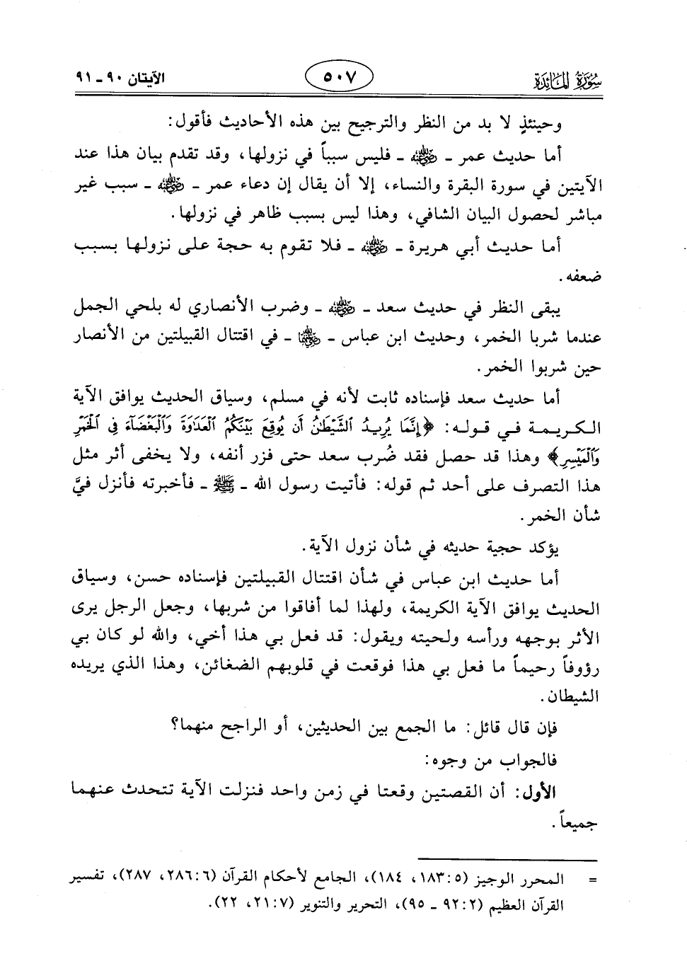 أما حديث عمر - رَضِيَ اللَّهُ عَنْهُ - فليس سبباً في نزولها، وقد تقدم بيان هذا عند الآيتين في سورة البقرة والنساء، إلا أن يقال إن دعاء عمر - رَضِيَ اللَّهُ عَنْهُ - سبب غير مباشر لحصول البيان الشافي، وهذا ليس بسبب ظاهر في نزولها.