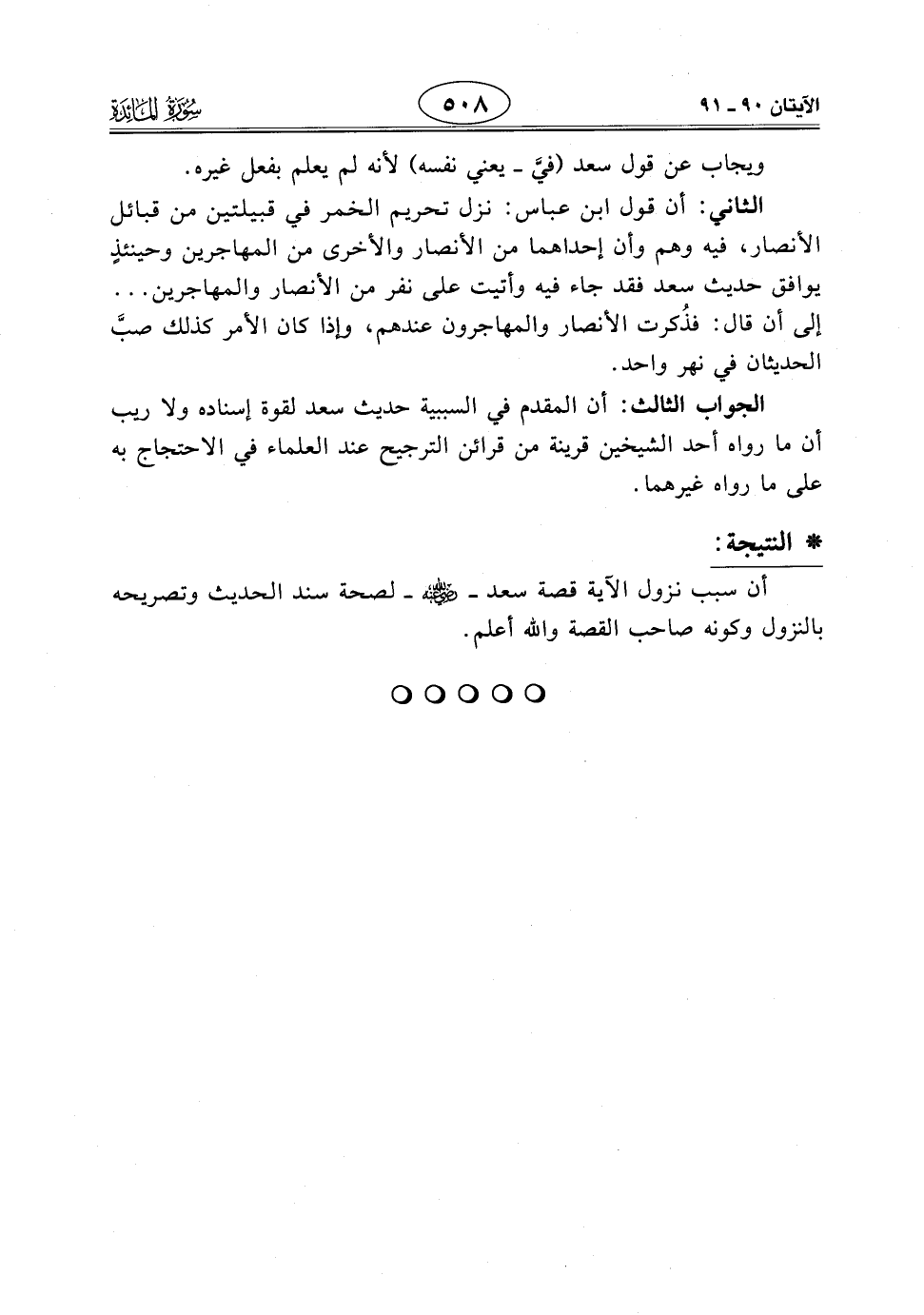 الجواب الثالث: أن المقدم في السببية حديث سعد لقوة إسناده ولا ريب أن ما رواه أحد الشيخين قرينة من قرائن الترجيح عند العلماء في الاحتجاج به على ما رواه غيرهما.
