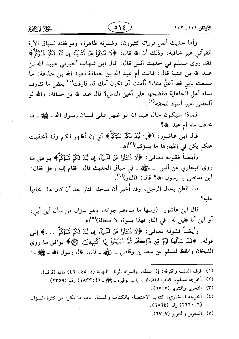 وأيضاً فقوله تعالى: (لَا تَسْأَلُوا عَنْ أَشْيَاءَ إِنْ تُبْدَ لَكُمْ تَسُؤْكُمْ ... ) إلى قوله: (قَدْ سَأَلَهَا قَوْمٌ مِنْ قَبْلِكُمْ ثُمَّ أَصْبَحُوا بِهَا كَافِرِينَ) يوافق ما روى الشيخان واللفظ لمسلم عن سعد بن وقاص - رَضِيَ اللَّهُ عَنْهُ - قال: قال رسول الله - صَلَّى اللَّهُ عَلَيْهِ وَسَلَّمَ -: