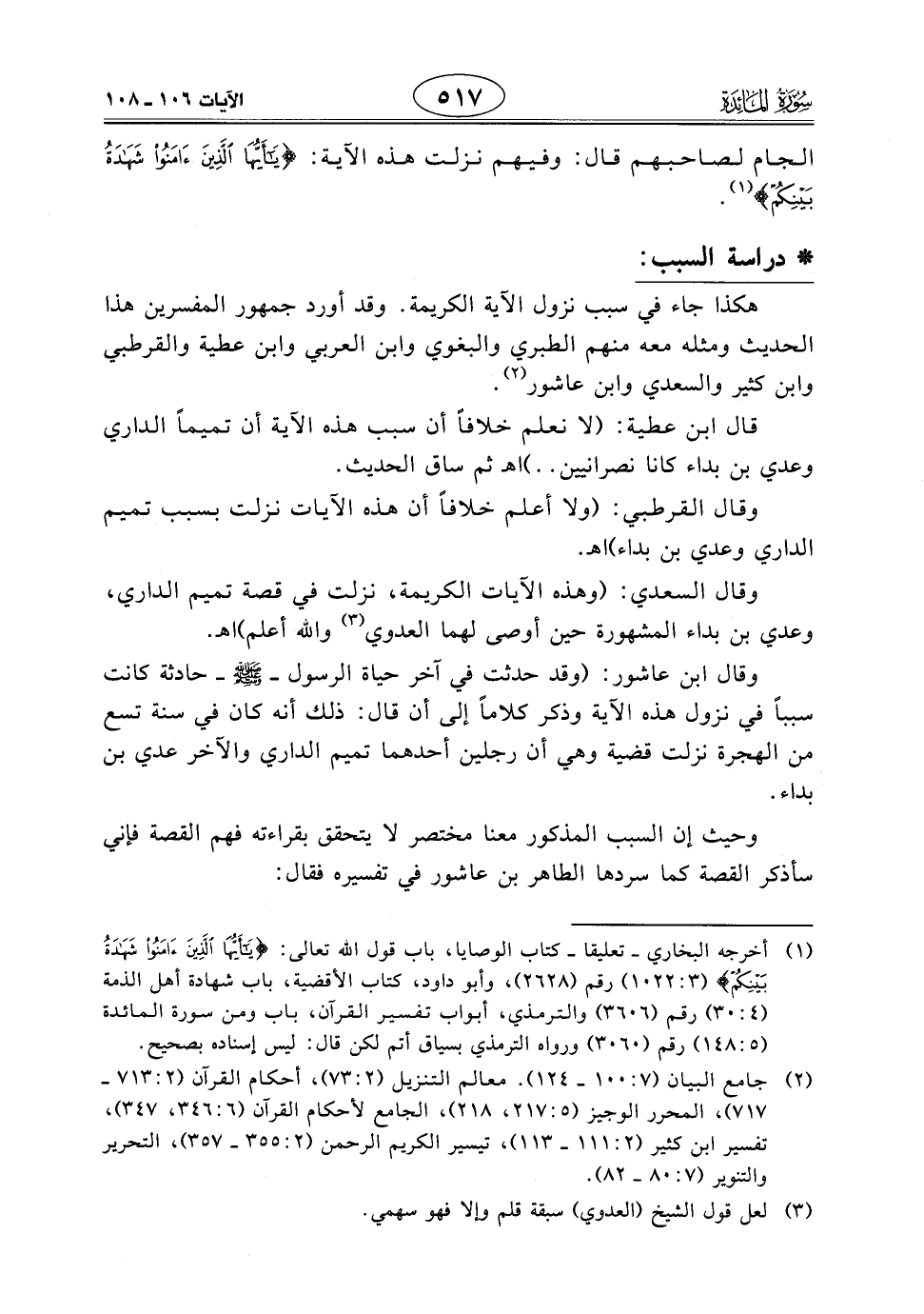 وقال السعدي: (وهذه الآيات الكريمة، نزلت في قصة تميم الداري، وعدي بن بداء المشهورة حين أوصى لهما العدوي واللَّه أعلم) اهـ.