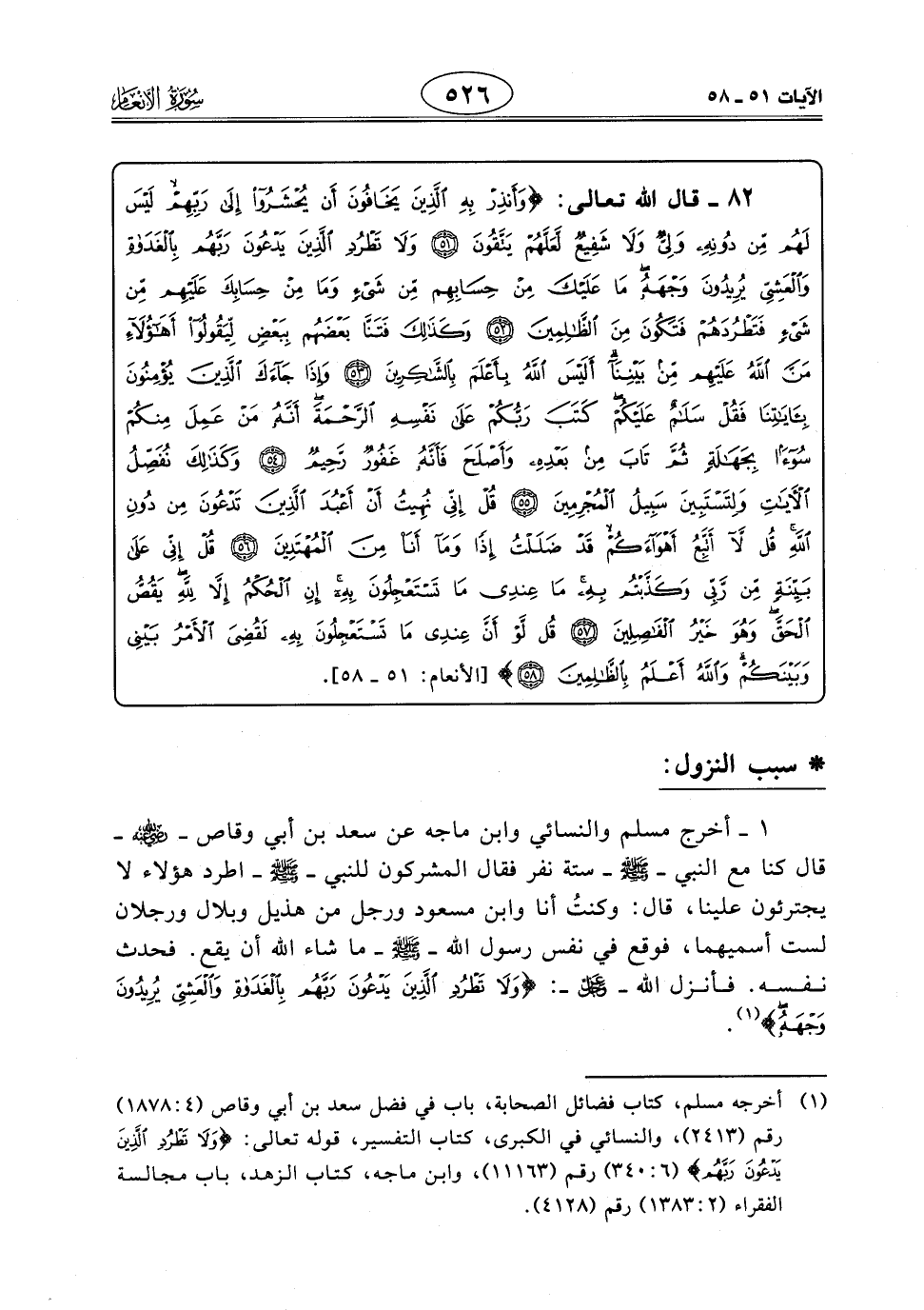 82 - قال اللَّه تعالى: (وَأَنْذِرْ بِهِ الَّذِينَ يَخَافُونَ أَنْ يُحْشَرُوا إِلَى رَبِّهِمْ لَيْسَ لَهُمْ مِنْ دُونِهِ وَلِيٌّ وَلَا شَفِيعٌ لَعَلَّهُمْ يَتَّقُونَ (51) وَلَا تَطْرُدِ الَّذِينَ يَدْعُونَ رَبَّهُمْ بِالْغَدَاةِ وَالْعَشِيِّ يُرِيدُونَ وَجْهَهُ مَا عَلَيْكَ مِنْ حِسَابِهِمْ مِنْ شَيْءٍ وَمَا مِنْ حِسَابِكَ عَلَيْهِمْ مِنْ شَيْءٍ فَتَطْرُدَهُمْ فَتَكُونَ مِنَ الظَّالِمِينَ (52) وَكَذَلِكَ فَتَنَّا بَعْضَهُمْ بِبَعْضٍ لِيَقُولُوا أَهَؤُلَاءِ مَنَّ اللَّهُ عَلَيْهِمْ مِنْ بَيْنِنَا أَلَيْسَ اللَّهُ بِأَعْلَمَ بِالشَّاكِرِينَ (53) وَإِذَا جَاءَكَ الَّذِينَ يُؤْمِنُونَ بِآيَاتِنَا فَقُلْ سَلَامٌ عَلَيْكُمْ كَتَبَ رَبُّكُمْ عَلَى نَفْسِهِ الرَّحْمَةَ أَنَّهُ مَنْ عَمِلَ مِنْكُمْ سُوءًا بِجَهَالَةٍ ثُمَّ تَابَ مِنْ بَعْدِهِ وَأَصْلَحَ فَأَنَّهُ غَفُورٌ رَحِيمٌ (54) وَكَذَلِكَ نُفَصِّلُ الْآيَاتِ وَلِتَسْتَبِينَ سَبِيلُ الْمُجْرِمِينَ (55) قُلْ إِنِّي نُهِيتُ أَنْ أَعْبُدَ الَّذِينَ تَدْعُونَ مِنْ دُونِ اللَّهِ قُلْ لَا أَتَّبِعُ أَهْوَاءَكُمْ قَدْ ضَلَلْتُ إِذًا وَمَا أَنَا مِنَ الْمُهْتَدِينَ (56) قُلْ إِنِّي عَلَى بَيِّنَةٍ مِنْ رَبِّي وَكَذَّبْتُمْ بِهِ مَا عِنْدِي مَا تَسْتَعْجِلُونَ بِهِ إِنِ الْحُكْمُ إِلَّا لِلَّهِ يَقُصُّ الْحَقَّ وَهُوَ خَيْرُ الْفَاصِلِينَ (57) قُلْ لَوْ أَنَّ عِنْدِي مَا تَسْتَعْجِلُونَ بِهِ لَقُضِيَ الْأَمْرُ بَيْنِي وَبَيْنَكُمْ وَاللَّهُ أَعْلَمُ بِالظَّالِمِينَ (58)