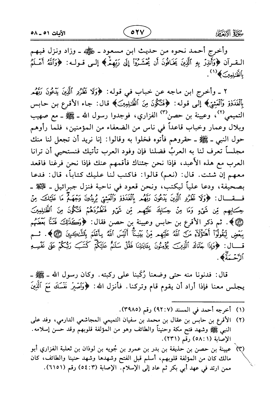 2 - وأخرج ابن ماجه عن خباب في قوله: (وَلَا تَطْرُدِ الَّذِينَ يَدْعُونَ رَبَّهُمْ بِالْغَدَاةِ وَالْعَشِيِّ) إلى قوله: (فَتَكُونَ مِنَ الظَّالِمِينَ) قال: جاء الأقرع بن حابس التميمي، وعيينة بن حصن الفزاري، فوجدوا رسول اللَّه - صَلَّى اللَّهُ عَلَيْهِ وَسَلَّمَ - مع صهيب وبلال وعمار وخباب قاعداً في ناس من الضعفاء من المؤمنين، فلما رأوهم حول النبي - صَلَّى اللَّهُ عَلَيْهِ وَسَلَّمَ - حقروهم فأتوه فخلوا به وقالوا: إنا نريد أن تجعل لنا منك مجلساً تعرف لنا به العربُ فضلنا فإن وفود العرب تأتيك فنستحيي أن ترانا العرب مع هذه الأَعبد، فإذا نحن جئناك فأقمهم عنك فإذا نحن فرغنا فاقعد معهم إن شئت. قال: (نعم) قالوا: فاكتب لنا عليك كتاباً، قال: فدعا بصحيفة، ودعا علياً ليكتب، ونحن قعود في ناحية فنزل جبرائيل - عليه السلام - فقال: (وَلَا تَطْرُدِ الَّذِينَ يَدْعُونَ رَبَّهُمْ بِالْغَدَاةِ وَالْعَشِيِّ يُرِيدُونَ وَجْهَهُ مَا عَلَيْكَ مِنْ حِسَابِهِمْ مِنْ شَيْءٍ وَمَا مِنْ حِسَابِكَ عَلَيْهِمْ مِنْ شَيْءٍ فَتَطْرُدَهُمْ فَتَكُونَ مِنَ الظَّالِمِينَ). ثم ذكر الأقرع بن حابس وعيينة بن حصن فقال: (وَكَذَلِكَ فَتَنَّا بَعْضَهُمْ بِبَعْضٍ لِيَقُولُوا أَهَؤُلَاءِ مَنَّ اللَّهُ عَلَيْهِمْ مِنْ بَيْنِنَا أَلَيْسَ اللَّهُ بِأَعْلَمَ بِالشَّاكِرِينَ). ثم قال: (وَإِذَا جَاءَكَ الَّذِينَ يُؤْمِنُونَ بِآيَاتِنَا فَقُلْ سَلَامٌ عَلَيْكُمْ كَتَبَ رَبُّكُمْ عَلَى نَفْسِهِ الرَّحْمَةَ).