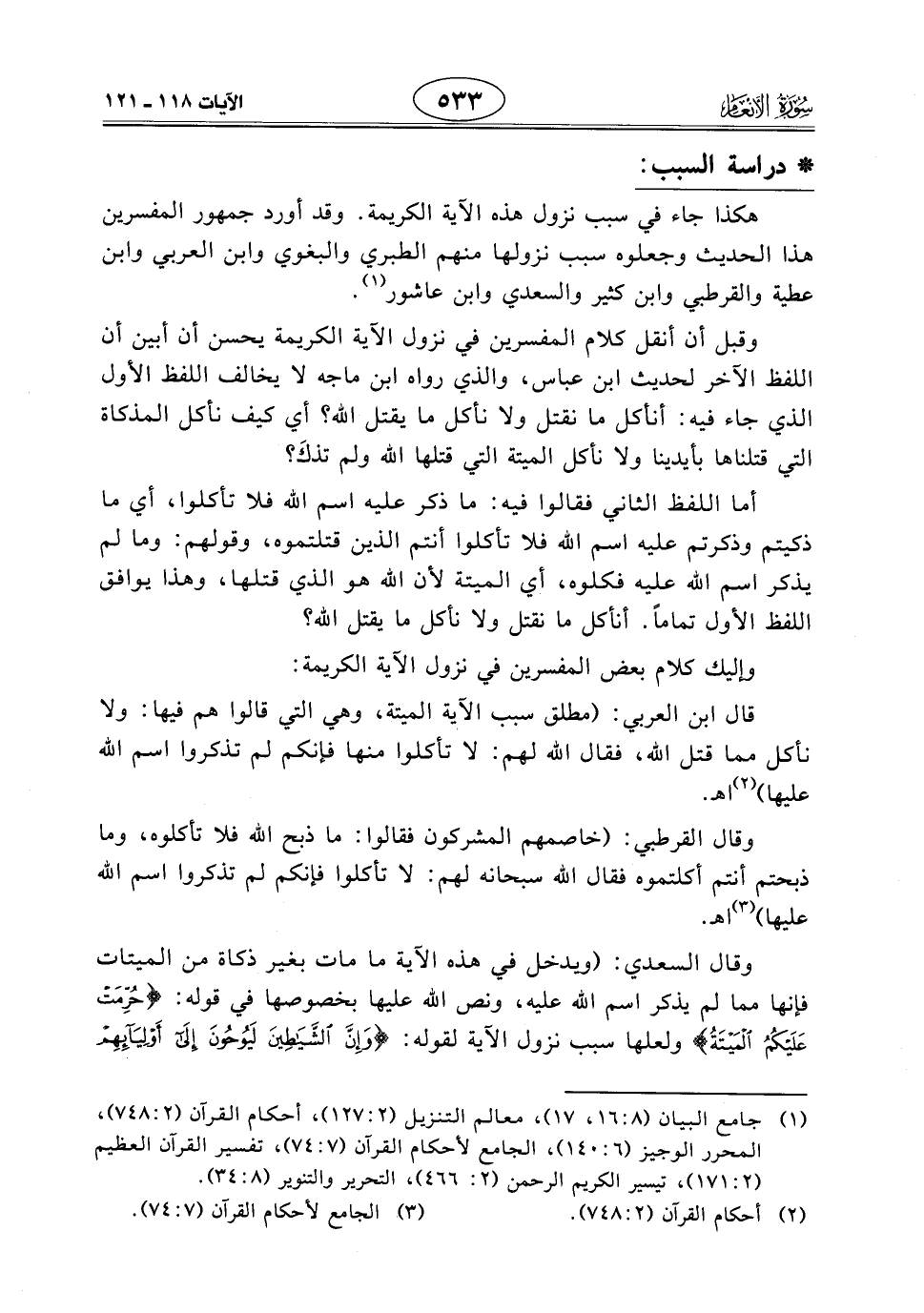 وقبل أن أنقل كلام المفسرين في نزول الآية الكريمة يحسن أن أبين أن اللفظ الآخر لحديث ابن عبَّاسٍ، والذي رواه ابن ماجه لا يخالف اللفظ الأول الذي جاء فيه: أنأكل ما نقتل ولا نأكل ما يقتل اللَّه؟ أي كيف نأكل المذكاة التي قتلناها بأيدينا ولا نأكل الميتة التي قتلها اللَّه ولم تذكَّ؟