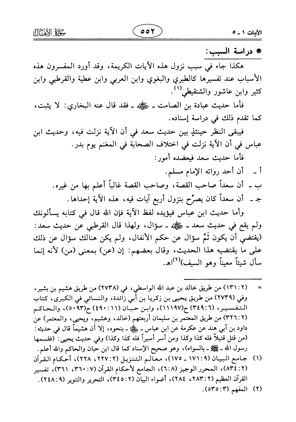 وأما حديث ابن عبَّاسٍ فيؤيده لفظ الآية فإن الله قال في كتابه يسألونك ولم يقع في حديث سعد - رَضِيَ اللَّهُ عَنْهُ - سؤال، ولهذا قال القرطبي عن حديث سعد: (يقتضي أن يكون ثَمَّ سؤال عن حكم الأنفال، ولم يكن هنالك سؤال عن ذلك على ما يقتضيه هذا الحديث، وقال بعضهم: إن (عن) بمعنى (من) لأنه إنما سأل شيئًا معينًا وهو السيف) اهـ.