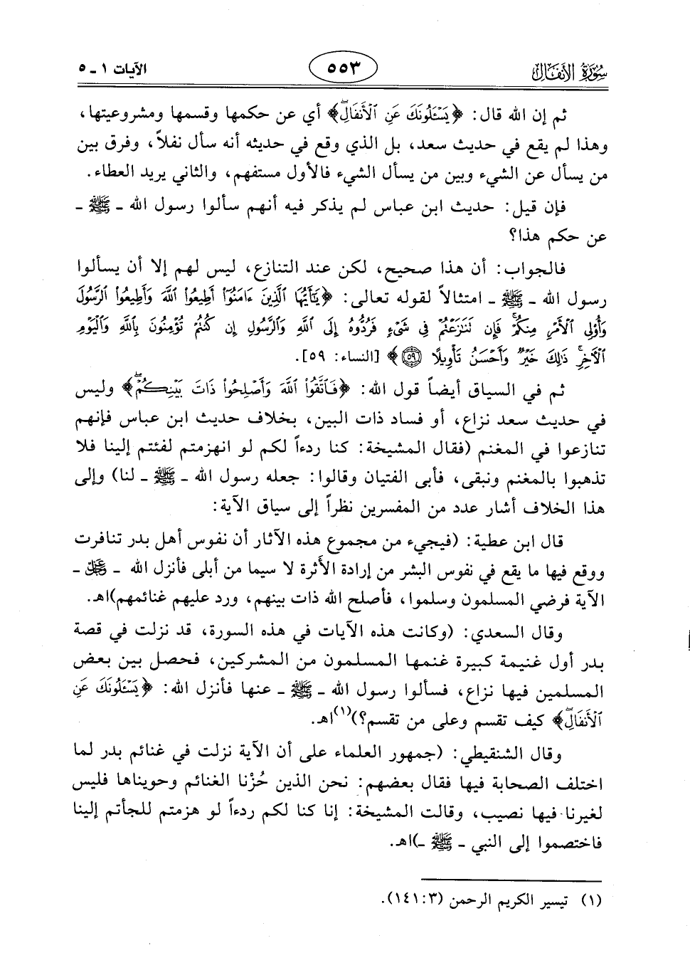 ثم إن اللَّه قال: (يَسْأَلُونَكَ عَنِ الْأَنْفَالِ) أي عن حكمها وقسمها ومشروعيتها، وهذا لم يقع في حديث سعد، بل الذي وقع في حديثه أنه سأل نفلاً، وفرق بين من يسأل عن الشيء وبين من يسأل الشيء فالأول مستفهم، والثاني يريد العطاء.