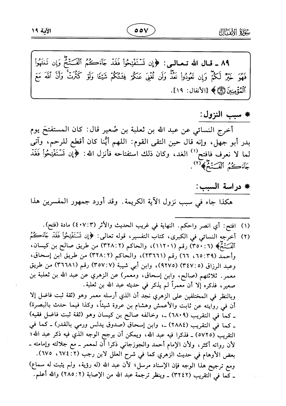 أخرج النَّسَائِي عن عبد الله بن ثعلبة بن صُعير قال: كان المستفتحَ يوم بدر أبو جهل، وإنه قال حين التقى القوم: اللهم أيُّنا كان أقطع للرحم، وآتى لما لا نعرف فافتح الغد، وكان ذلك استفتاحه فأنزل اللَّه: (إِنْ تَسْتَفْتِحُوا فَقَدْ جَاءَكُمُ الْفَتْحُ).