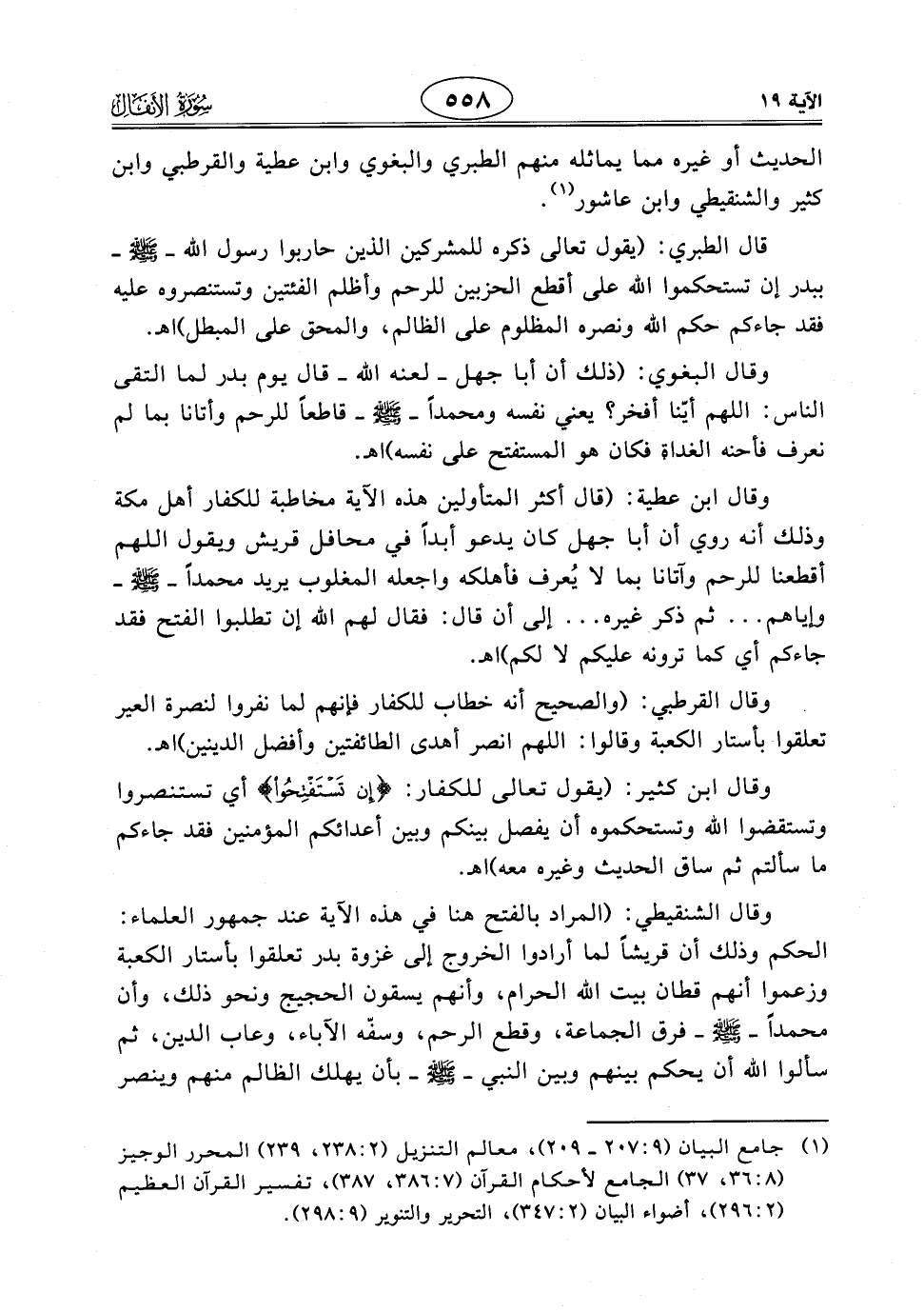 وقال الشنقيطي: (المراد بالفتح هنا في هذه الآية عند جمهور العلماء: الحكم وذلك أن قريشاً لما أرادوا الخروج إلى غزوة بدر تعلقوا بأستار الكعبة وزعموا أنهم قطان بيت الله الحرام، وأنهم يسقون الحجيج ونحو ذلك، وأن محمداً - صَلَّى اللَّهُ عَلَيْهِ وَسَلَّمَ - فرق الجماعة، وقطع الرحم، وسفّه الآباء، وعاب الدين، ثم سألوا اللَّه أن يحكم بينهم وبين النبي - صَلَّى اللَّهُ عَلَيْهِ وَسَلَّمَ - بأن يهلك الظالم منهم وينصر