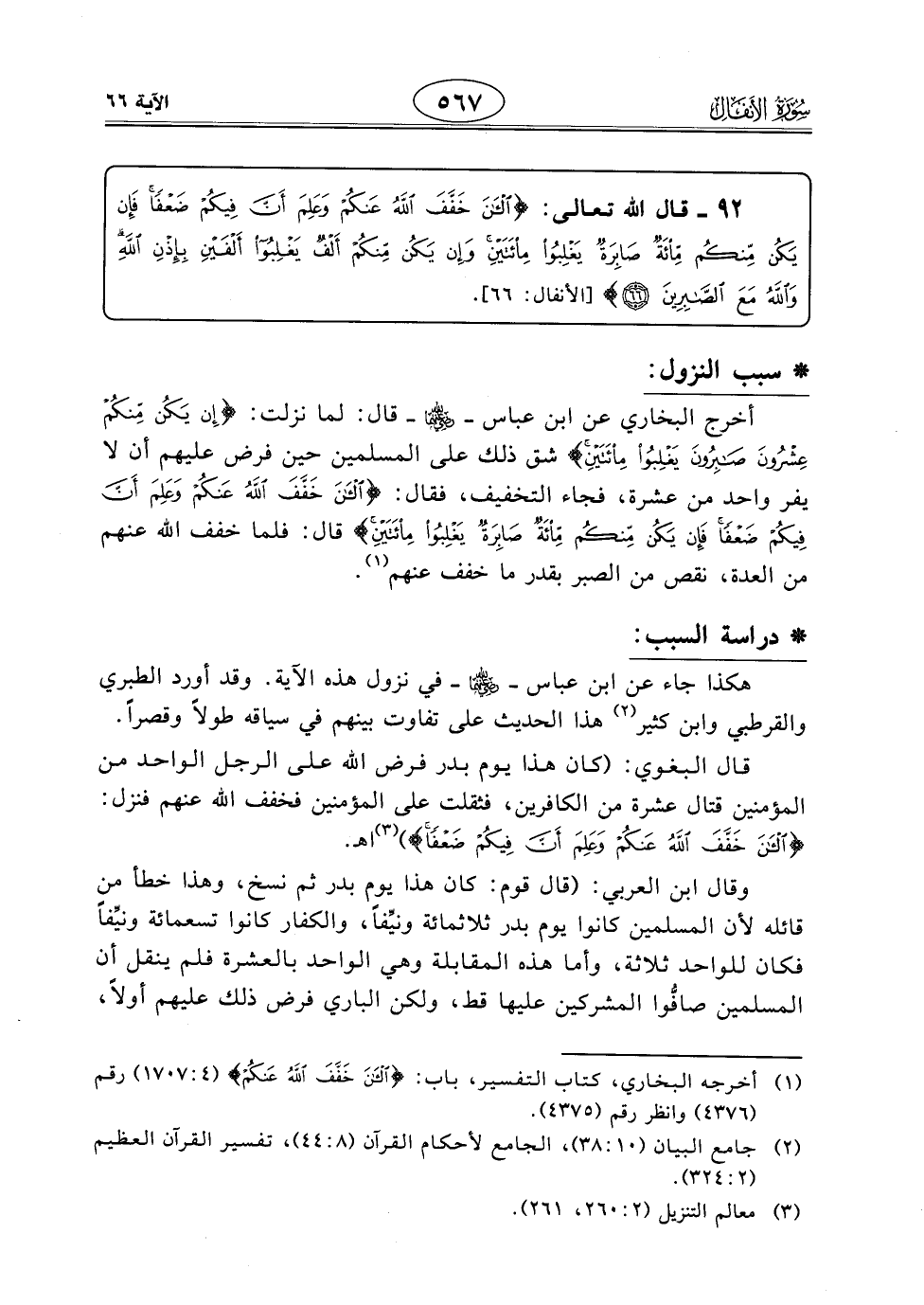 أخرج البخاري عن ابن عبَّاسٍ - رَضِيَ اللَّهُ عَنْهُمَا - قال: لما نزلت: (إِنْ يَكُنْ مِنْكُمْ عِشْرُونَ صَابِرُونَ يَغْلِبُوا مِائَتَيْنِ) شق ذلك على المسلمين حين فرض عليهم أن لا يفر واحد من عشرة، فجاء التخفيف، فقال: (الْآنَ خَفَّفَ اللَّهُ عَنْكُمْ وَعَلِمَ أَنَّ فِيكُمْ ضَعْفًا فَإِنْ يَكُنْ مِنْكُمْ مِائَةٌ صَابِرَةٌ يَغْلِبُوا مِائَتَيْنِ) قال: فلما خفف الله عنهم من العدة، نقص من الصبر بقدر ما خفف عنهم.