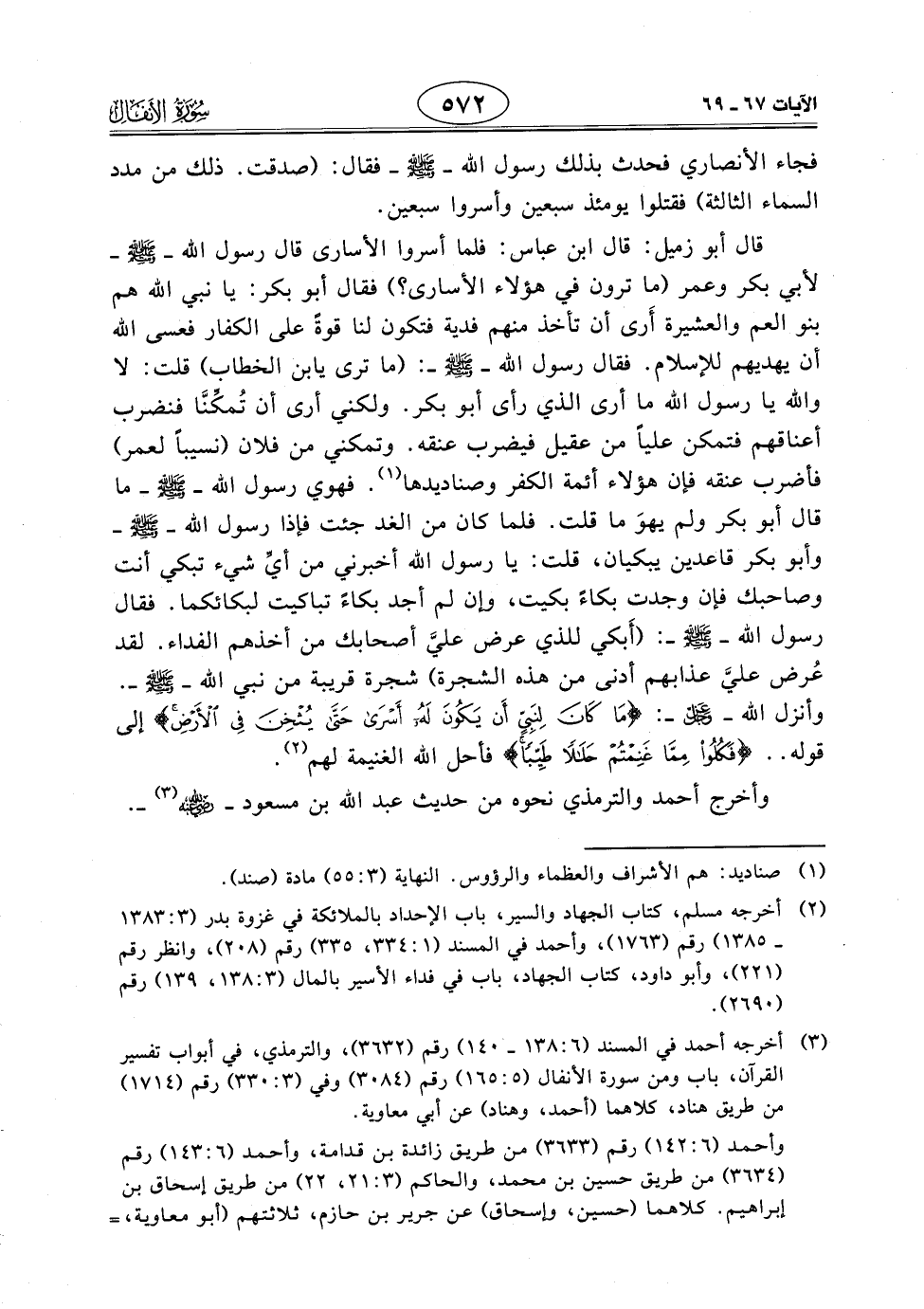قال أبو زميل: قال ابن عبَّاسٍ: فلما أسروا الأسارى قال رسول الله - صَلَّى اللَّهُ عَلَيْهِ وَسَلَّمَ - لأبي بكر وعمر (ما ترون في هؤلاء الأسارى؟) فقال أبو بكر: يا نبي اللَّه هم بنو العم والعشيرة أَرى أن تأخذ منهم فدية فتكون لنا قوةً على الكفار فعسى الله أن يهديهم للإسلام. فقال رسول الله - صَلَّى اللَّهُ عَلَيْهِ وَسَلَّمَ -: (ما ترى يا ابن الخطاب) قلت: لا والله يا رسول الله ما أرى الذي رأى أبو بكر. ولكني أرى أن تُمكِّنَّا فنضرب أعناقهم فتمكن علياً من عقيل فيضرب عنقه. وتمكني من فلان (نسيباً لعمر) فأضرب عنقه فإن هؤلاء أئمة الكفر وصناديدها. فهوي رسول الله - صَلَّى اللَّهُ عَلَيْهِ وَسَلَّمَ - ما قال أبو بكر ولم يهوَ ما قلت. فلما كان من الغد جئت فإذا رسول اللَّه - صَلَّى اللَّهُ عَلَيْهِ وَسَلَّمَ - وأبو بكر قاعدين يبكيان، قلت: يا رسول الله أخبرني من أيِّ شيء تبكي أنت وصاحبك فإن وجدت بكاءً بكيت، وإن لم أجد بكاءً تباكيت لبكائكما. فقال رسول اللَّه - صَلَّى اللَّهُ عَلَيْهِ وَسَلَّمَ -: (أَبكي للذي عرض عليَّ أصحابك من أخذهم الفداء. لقد عُرض عليَّ عذابهم أدنى من هذه الشجرة) شجرة قريبة من نبي اللَّه - صَلَّى اللَّهُ عَلَيْهِ وَسَلَّمَ -. وأنزل اللَّه - عَزَّ وَجَلَّ -: (مَا كَانَ لِنَبِيٍّ أَنْ يَكُونَ لَهُ أَسْرَى حَتَّى يُثْخِنَ فِي الْأَرْضِ) إلى قوله .. (فَكُلُوا مِمَّا غَنِمْتُمْ حَلَالًا طَيِّبًا) فأحل اللَّه الغنيمة لهم.