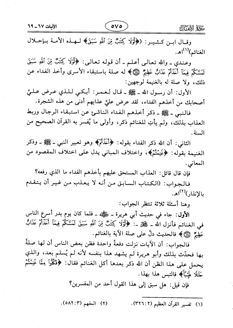 فالنبي - صَلَّى اللَّهُ عَلَيْهِ وَسَلَّمَ - ذكر أخذهم الفداء الناشئ عن استبقاء الرجال وربط العذاب بذلك، ولم يأتِ للغنائم ذكر، وأولى ما يُفسر به القرآن الصحيح من السنة.