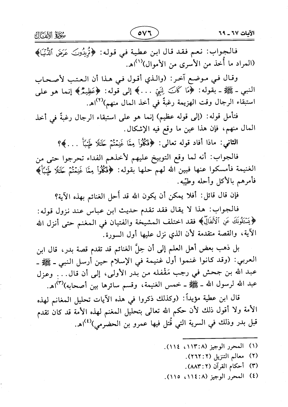 قال ابن عطية مؤيدًا: (وكذلك ذكروا في هذه الآيات تحليل المغانم لهذه الأمة ولا أقول ذلك لأن حكم الله تعالى بتحليل المغنم لهذه الأمة قد كان تقدم قبل بدر وذلك في السرية التي قُتل فيها عمرو بن الحضرمي) اهـ.