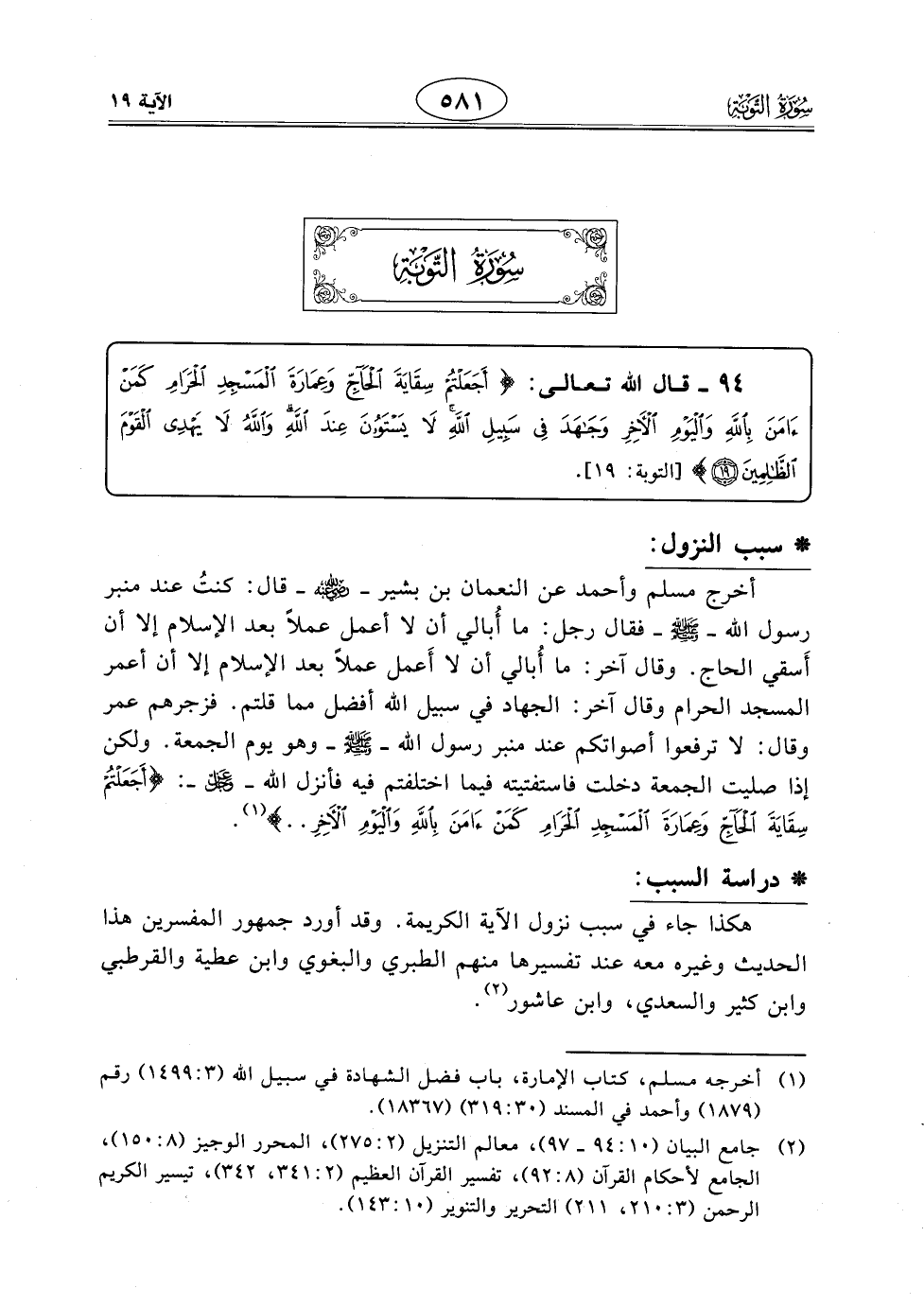 أخرج مسلم وأحمد عن النعمان بن بشير - رَضِيَ اللَّهُ عَنْهُ - قال: كنتُ عند منبر رسول اللَّه - صَلَّى اللَّهُ عَلَيْهِ وَسَلَّمَ - فقال رجل: ما أُبالي أن لا أعمل عملاً بعد الإسلام إلا أن أَسقي الحاج. وقال آخر: ما أُبالي أن لا أَعمل عملاً بعد الإسلام إلا أن أعمر المسجد الحرام وقال آخر: الجهاد في سبيل اللَّه أفضل مما قلتم. فزجرهم عمر وقال: لا ترفعوا أصواتكم عند منبر رسول الله - صَلَّى اللَّهُ عَلَيْهِ وَسَلَّمَ - وهو يوم الجمعة. ولكن إذا صليت الجمعة دخلت فاستفتيته فيما اختلفتم فيه فأنزل اللَّه - عَزَّ وَجَلَّ -: أَجَعَلْتُمْ سِقَايَةَ الْحَاجِّ وَعِمَارَةَ الْمَسْجِدِ الْحَرَامِ كَمَنْ آمَنَ بِاللَّهِ وَالْيَوْمِ الْآخِرِ .. ).