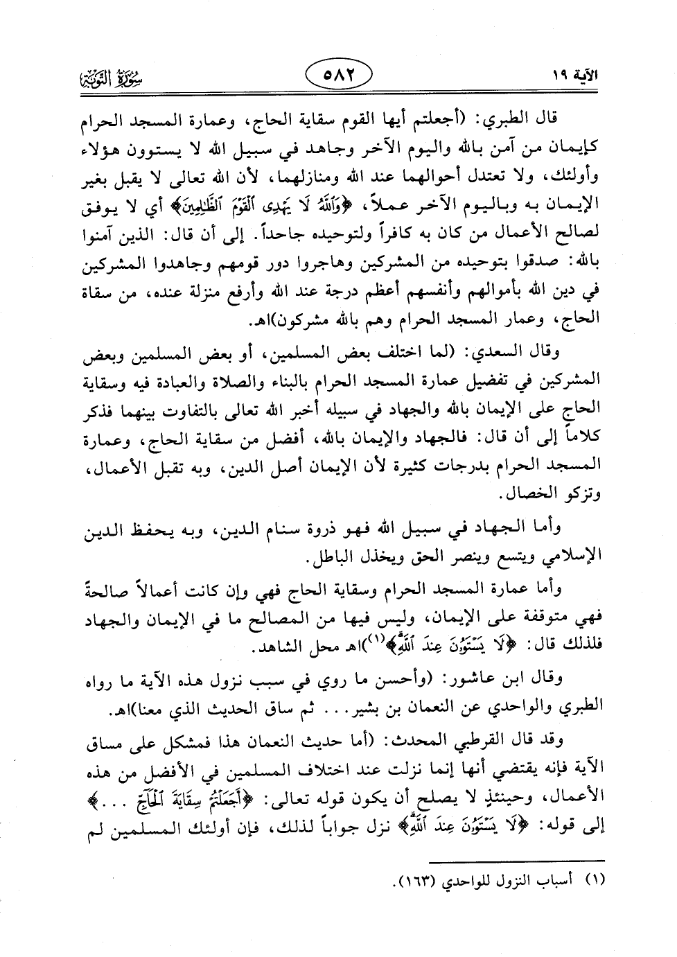 وقال السعدي: الما اختلف بعض المسلمين، أو بعض المسلمين وبعض المشركين في تفضيل عمارة المسجد الحرام بالبناء والصلاة والعبادة فيه وسقاية الحاج على الإيمان باللَّه والجهاد في سبيله أخبر الله تعالى بالتفاوت بينهما فذكر كلامًا إلى أن قال: فالجهاد والإيمان باللَّه، أفضل من سقاية الحاج، وعمارة المسجد الحرام بدرجات كثيرة لأن الإيمان أصل الدين، وبه تقبل الأعمال، وتزكو الخصال.