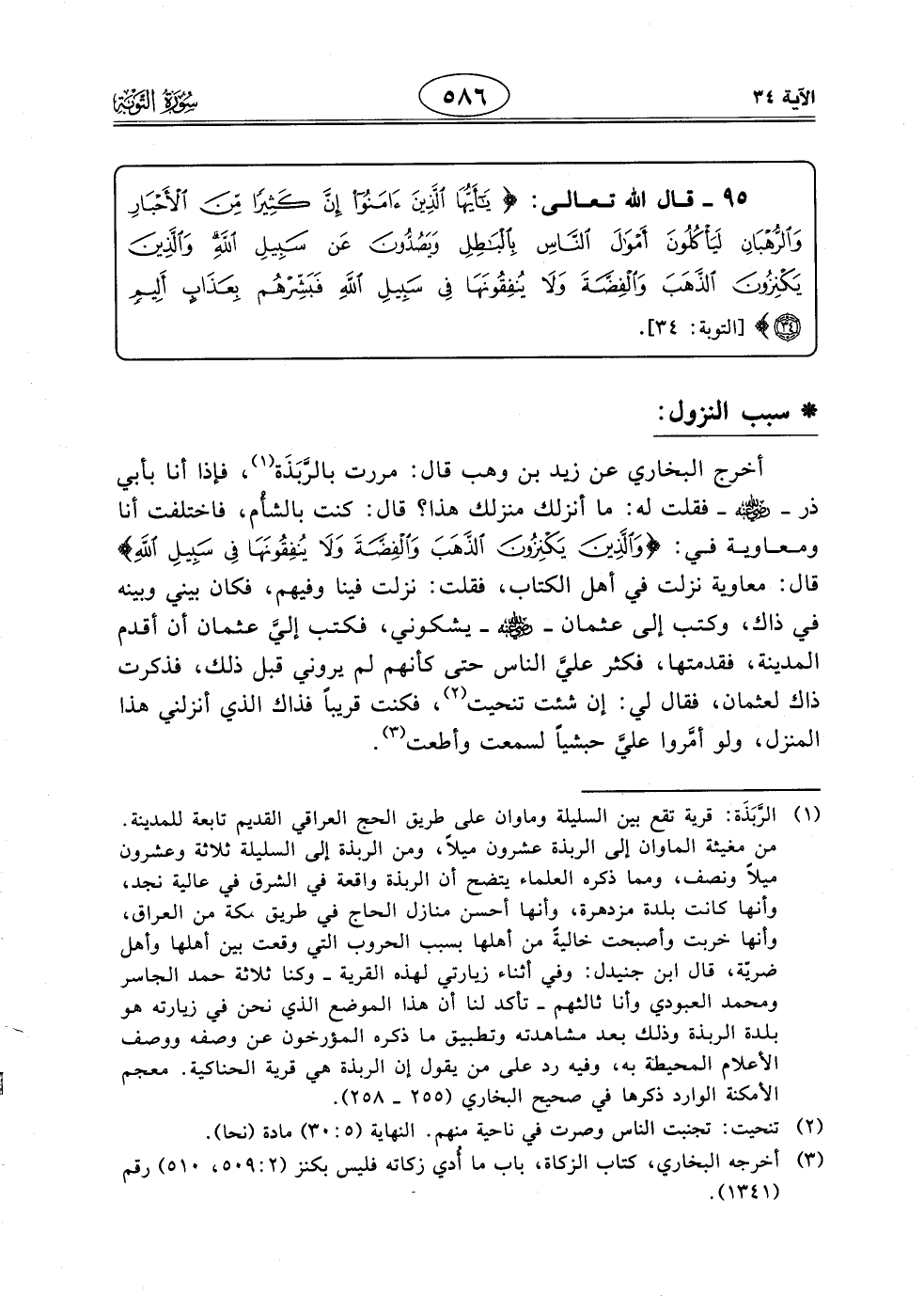 95 - قال الله تعالى: (يَا أَيُّهَا الَّذِينَ آمَنُوا إِنَّ كَثِيرًا مِنَ الْأَحْبَارِ وَالرُّهْبَانِ لَيَأْكُلُونَ أَمْوَالَ النَّاسِ بِالْبَاطِلِ وَيَصُدُّونَ عَنْ سَبِيلِ اللَّهِ وَالَّذِينَ يَكْنِزُونَ الذَّهَبَ وَالْفِضَّةَ وَلَا يُنْفِقُونَهَا فِي سَبِيلِ اللَّهِ فَبَشِّرْهُمْ بِعَذَابٍ أَلِيمٍ (34)