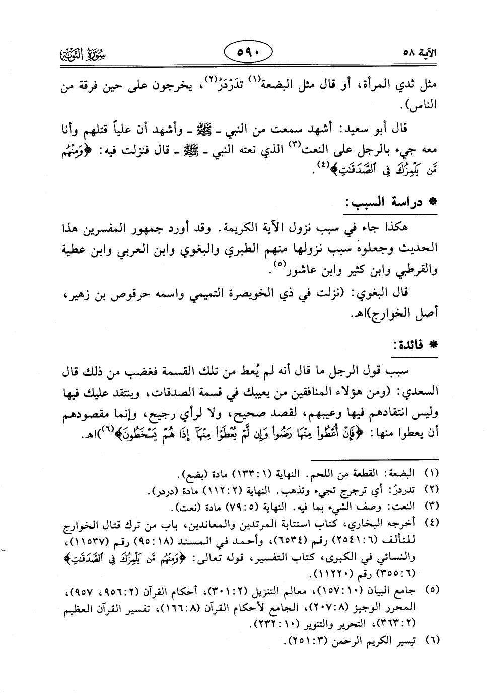 قال أبو سعيد: أشهد سمعت من النبي - صَلَّى اللَّهُ عَلَيْهِ وَسَلَّمَ - وأشهد أن علياً قتلهم وأنا معه جيء بالرجل على النعت الذي نعته النبي - صَلَّى اللَّهُ عَلَيْهِ وَسَلَّمَ - قال فنزلت فيه: وَمِنهُم (وَمِنْهُمْ مَنْ يَلْمِزُكَ فِي الصَّدَقَاتِ).