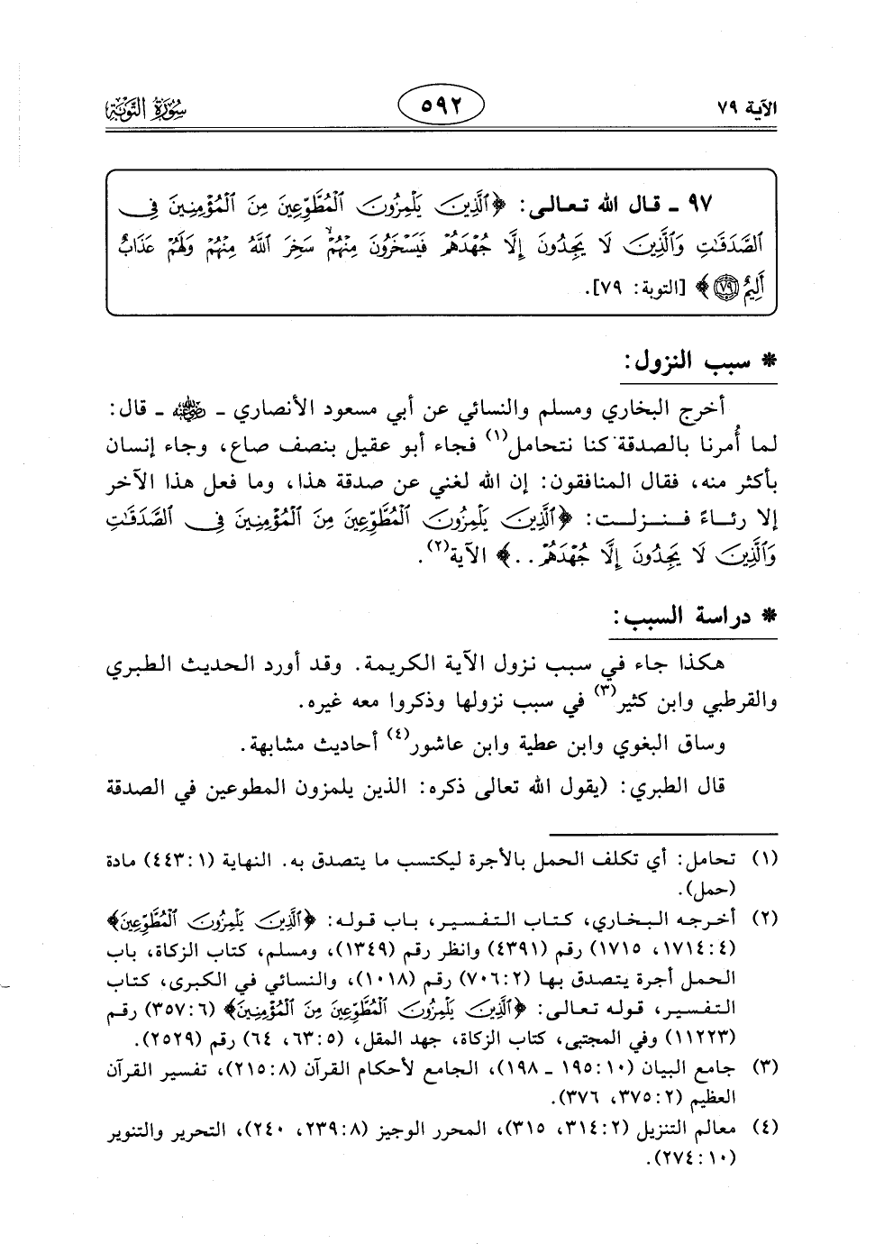 وساق البغوي وابن عطية وابن عاشور أحاديث مشابهة. قال الطبري: (يقول اللَّه تعالى ذكره: الذين يلمزون المطوعين في الصدقة