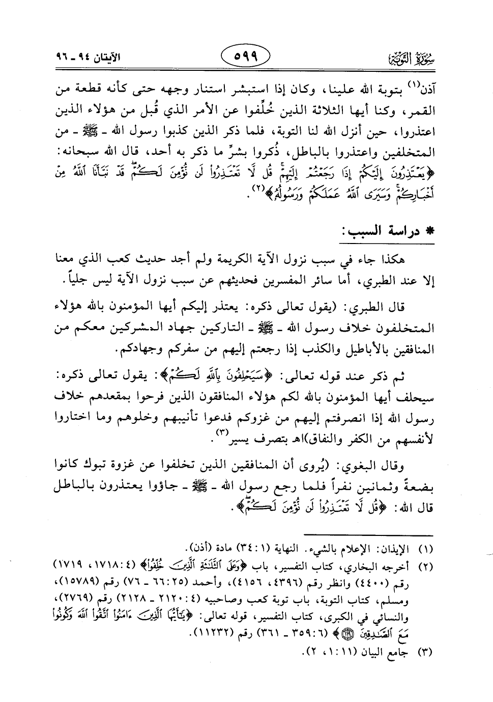 آذن بتوبة اللَّه علينا، وكان إذا استبشر استنار وجهه حتى كأنه قطعة من القمر، وكنا أيها الثلاثة الذين خُلِّفوا عن الأمر الذي قُبل من هؤلاء الذين اعتذروا، حين أنزل الله لنا التوبة، فلما ذكر الذين كذبوا رسول الله - صَلَّى اللَّهُ عَلَيْهِ وَسَلَّمَ - من المتخلفين واعتذروا بالباطل، ذُكروا بشرّ ما ذكر به أحد، قال الله سبحانه: (يَعْتَذِرُونَ إِلَيْكُمْ إِذَا رَجَعْتُمْ إِلَيْهِمْ قُلْ لَا تَعْتَذِرُوا لَنْ نُؤْمِنَ لَكُمْ قَدْ نَبَّأَنَا اللَّهُ مِنْ أَخْبَارِكُمْ وَسَيَرَى اللَّهُ عَمَلَكُمْ وَرَسُولُهُ).