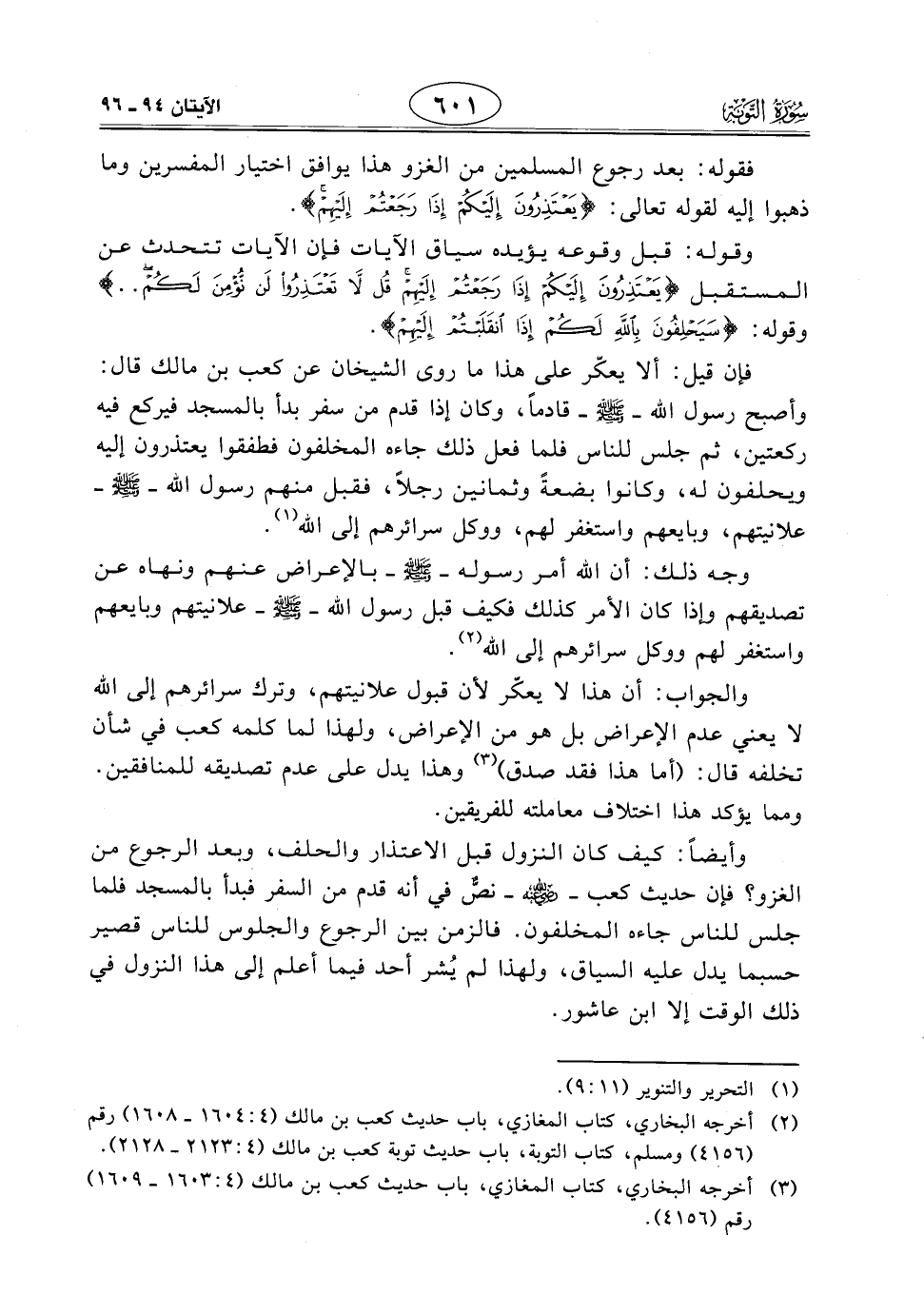 وأيضاً: كيف كان النزول قبل الاعتذار والحلف، وبعد الرجوع من الغزو؟ فإن حديث كعب - رَضِيَ اللَّهُ عَنْهُ - نص في أنه قدم من السفر فبدأ بالمسجد فلما جلس للناس جاءه المخلفون. فالزمن بين الرجوع والجلوس للناس قصير حسبما يدل عليه السياق، ولهذا لم يُشر أحد فيما أعلم إلى هذا النزول في ذلك الوقت إلا ابن عاشور.