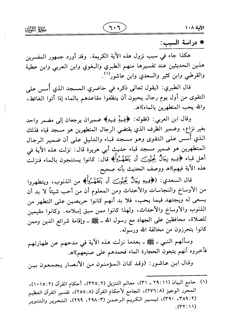 وقال ابن العربي: (فقوله: (فِيهِ فِيهِ) ضميران يرجعان إلى مضمر واحد بغير نزاع، وضمير الظرف الذي يقتضي الرجال المتطهرين هو مسجد قباء فذلك الذي أسس على التقوى وهو مسجد قباء والدليل على أن ضمير الرجال المتطهرين هو ضمير مسجد قباء حديث أبي هريرة قال: نزلت هذه الآية في أهل قباء (فِيهِ رِجَالٌ يُحِبُّونَ أَنْ يَتَطَهَّرُوا) قال: كانوا يستنجون بالماء فنزلت هذه الآية فيهم) اهـ ووصف الحديث بأنه صحيح.