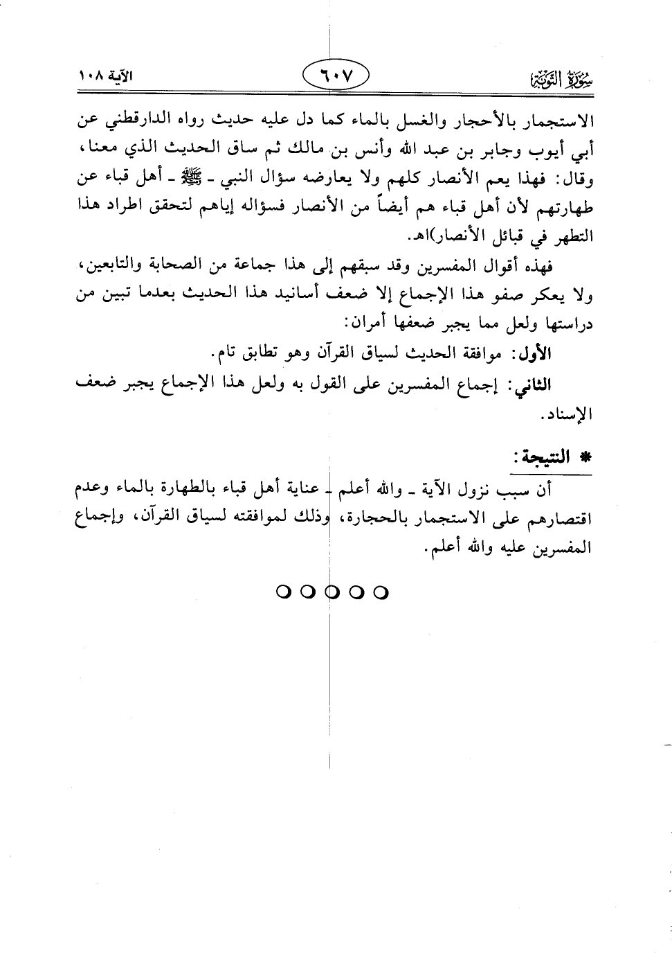 أن سبب نزول الآية - والله أعلم إعناية أهل قباء بالطهارة بالماء وعدم اقتصارهم على الاستجمار بالحجارة، ذلك لموافقته لسياق القرآن، وإجماع المفسرين عليه واللَّه أعلم.