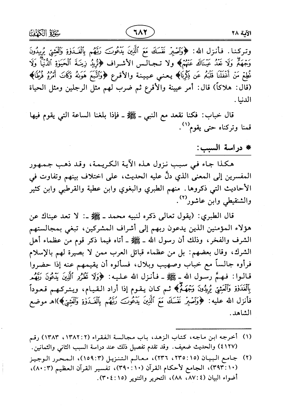 قال الطبري: (يقول تعالى ذكره لنبيه محمد - صَلَّى اللَّهُ عَلَيْهِ وَسَلَّمَ -: لا تعد عيناك عن هؤلاء المؤمنين الذين يدعون ربهم إلى أشراف المشركين، تبغي بمجالستهم الشرف والفخر، وذلك أن رسول الله - صَلَّى اللَّهُ عَلَيْهِ وَسَلَّمَ - أتاه فيما ذكر قوم من عظماء أهل الشرك، وقال بعضهم: بل من عظماء قبائل العرب ممن لا بصيرة لهم بالإسلام فرأوه جالساً مع خباب وصهيب وبلال، فسألوه أن يقيمهم عنه إذا حضروا قالوا: فهمَّ رسول الله - صَلَّى اللَّهُ عَلَيْهِ وَسَلَّمَ - فأنزل اللَّه عليه: (وَلَا تَطْرُدِ الَّذِينَ يَدْعُونَ رَبَّهُمْ بِالْغَدَاةِ وَالْعَشِيِّ يُرِيدُونَ وَجْهَهُ) ثم كان يقوم إذا أراد القيام، ويتركهم قعوداً فأنزل اللَّه عليه: (وَاصْبِرْ نَفْسَكَ مَعَ الَّذِينَ يَدْعُونَ رَبَّهُمْ بِالْغَدَاةِ وَالْعَشِيِّ) اهـ موضع الشاهد.