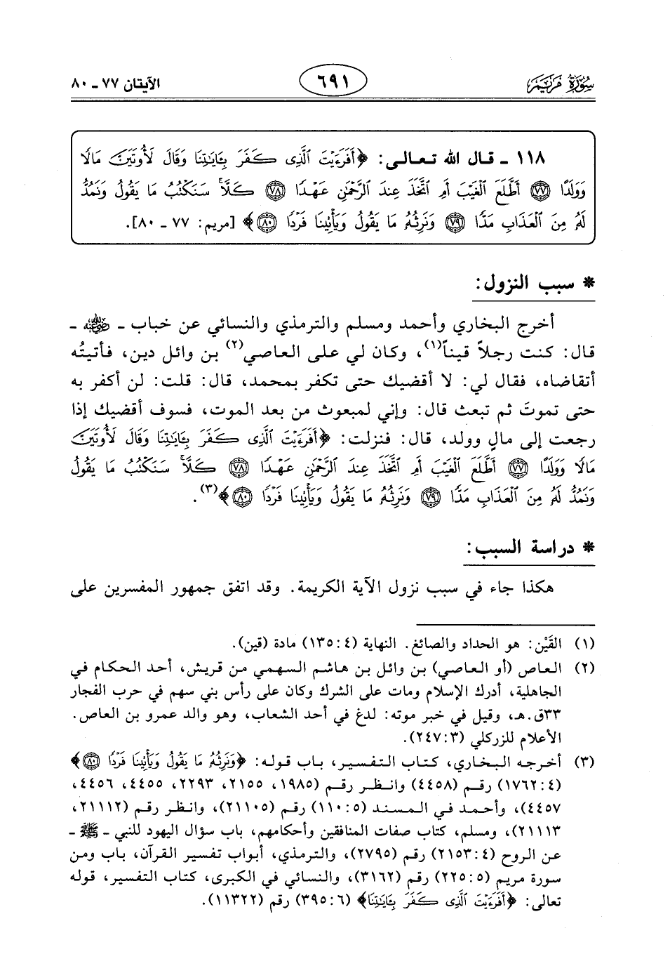 118 - قال الله تعالى: (أَفَرَأَيْتَ الَّذِي كَفَرَ بِآيَاتِنَا وَقَالَ لَأُوتَيَنَّ مَالًا وَوَلَدًا (77) أَطَّلَعَ الْغَيْبَ أَمِ اتَّخَذَ عِنْدَ الرَّحْمَنِ عَهْدًا (78) كَلَّا سَنَكْتُبُ مَا يَقُولُ وَنَمُدُّ لَهُ مِنَ الْعَذَابِ مَدًّا (79) وَنَرِثُهُ مَا يَقُولُ وَيَأْتِينَا فَرْدًا (80)