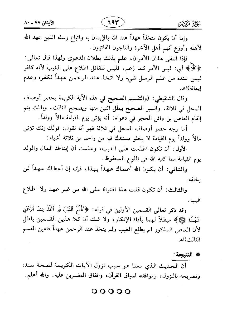 وقال الشنقيطي: (والتقسيم الصحيح في هذه الآية الكريمة يحصر أوصاف المحل في ثلاثة، والسبر الصحيح يبطل اثنين منها ويصحح الثالث، وبذلك يتم إلقام العاص بن وائل الحجر في دعواه: أنه يؤتى يوم القيامة مالاً وولدًا.
