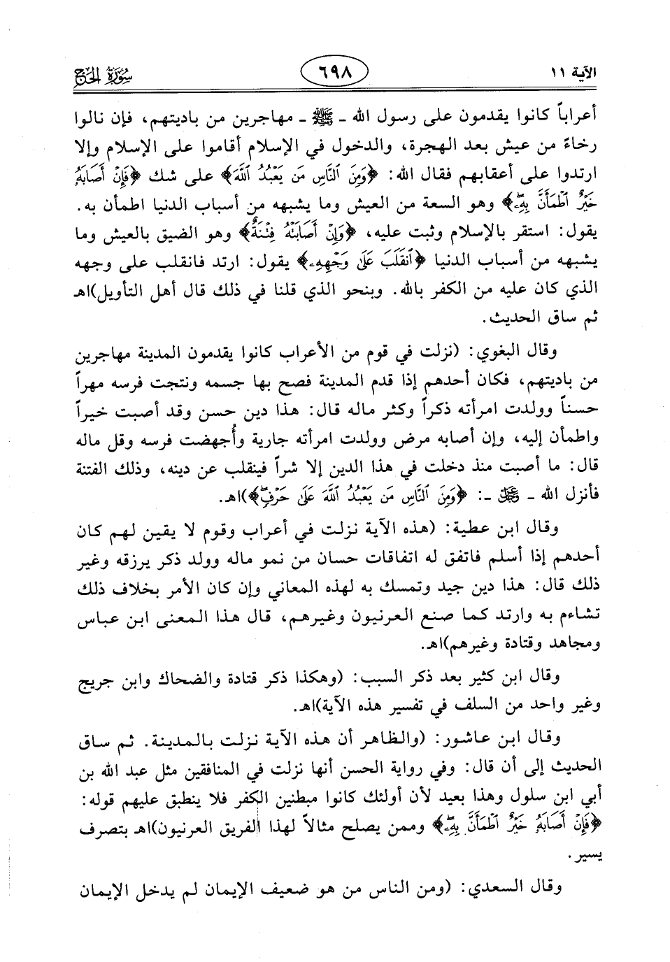 وقال ابن عاشور: (والظاهر أن هذه الآية نزلت بالمدينة. ثم ساق الحديث إلى أن قال: وفي رواية الحسن أنها نزلت في المنافقين مثل عبد اللَّه بن أبي ابن سلول وهذا بعيد لأن أولئك كانوا مبطنين الكفر فلا ينطبق عليهم قوله: (فَإِنْ أَصَابَهُ خَيْرٌ اطْمَأَنَّ بِهِ) وممن يصلح مثالاً لهذا الفريق العرنيون). اهـ بتصرف يسير.