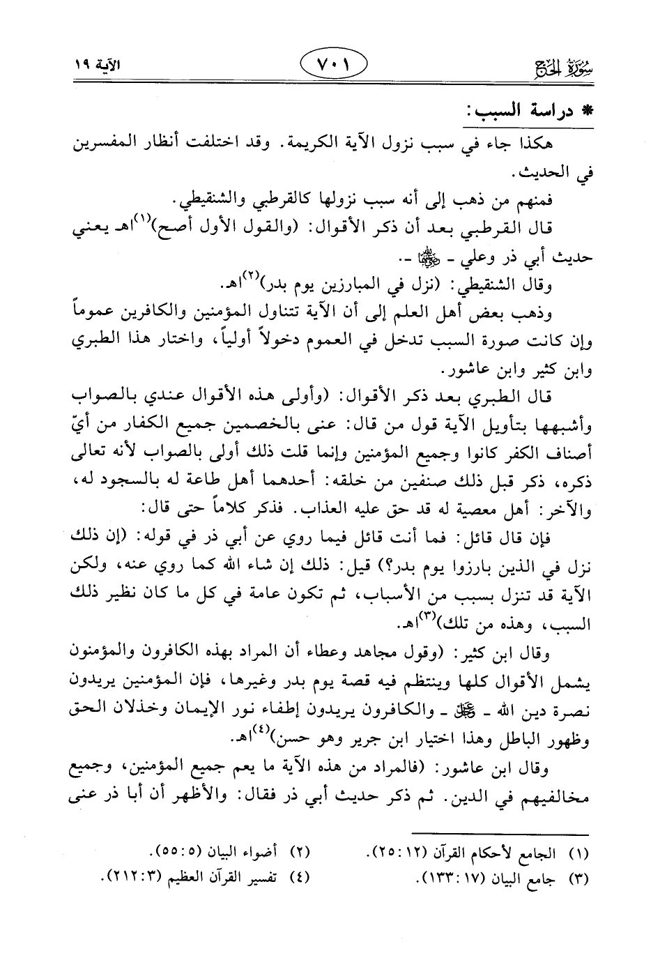 وقال الشنقيطي: (نزل في المبارزين يوم بدر) اهـ.