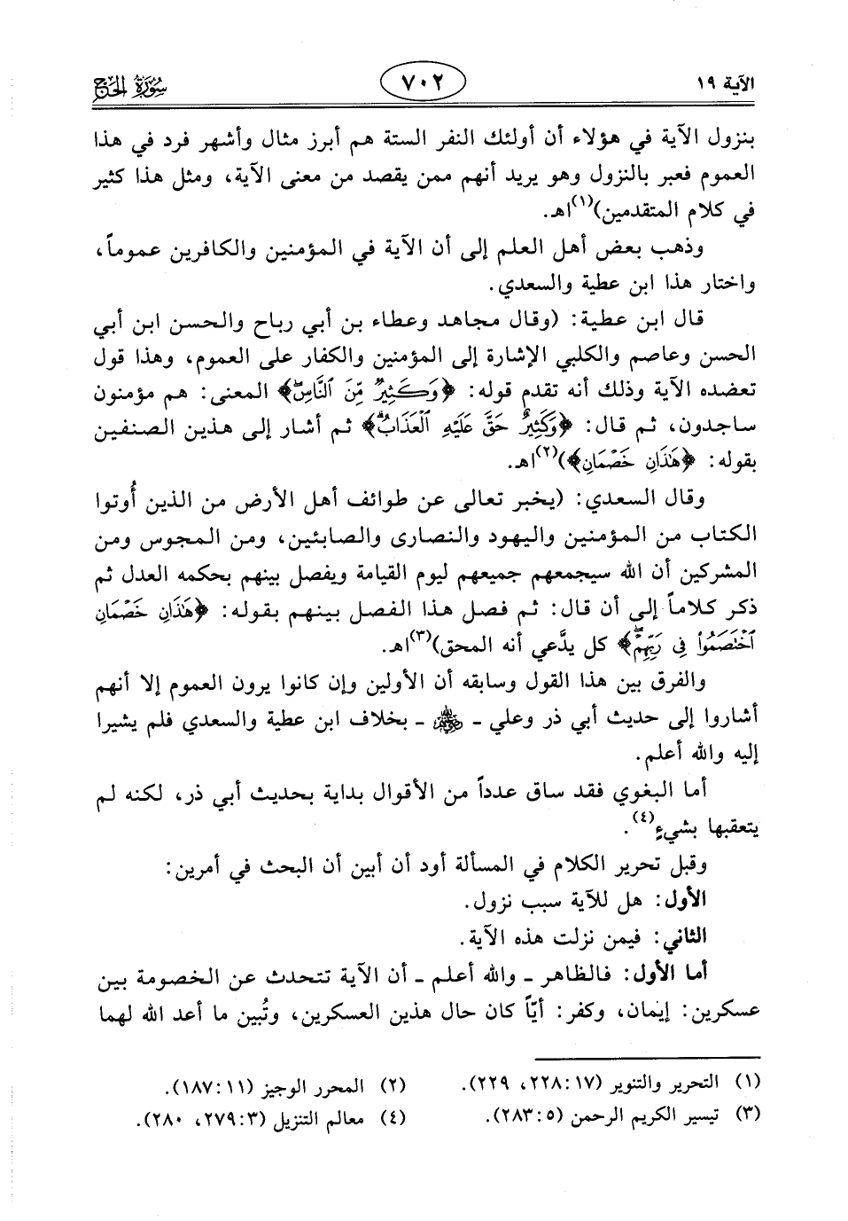 وقال السعدي: (يخبر تعالى عن طوائف أهل الأرض من الذين أُوتوا الكتاب من المؤمنين واليهود والنصارى والصابئين، ومن المجوس ومن المشركين أن اللَّه سيجمعهم جميعهم ليوم القيامة ويفصل بينهم بحكمه العدل ثم ذكر كلامًا إلى أن قال: ثم فصل هذا الفصل بينهم بقوله: (هَذَانِ خَصْمَانِ اخْتَصَمُوا فِي رَبِّهِمْ) كل يدَّعي أنه المحق) اهـ.