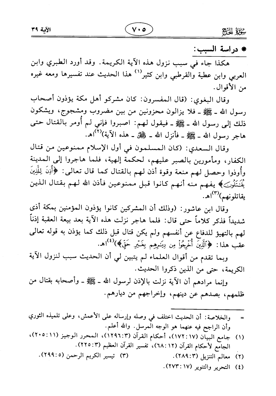وقال ابن عاشور: (وذلك أن المشركين كانوا يؤذون المؤمنين بمكة أذى شديداً فذكر كلامًا حتى قال: فلما هاجر نزلت هذه الآية بعد بيعة العقبة إذنًا لهم بالتهيؤ للدفاع عن أنفسهم ولم يكن قتال قبل ذلك كما يؤذن به قوله تعالى عقب هذا: (الَّذِينَ أُخْرِجُوا مِنْ دِيَارِهِمْ بِغَيْرِ حَقٍّ) اهـ.