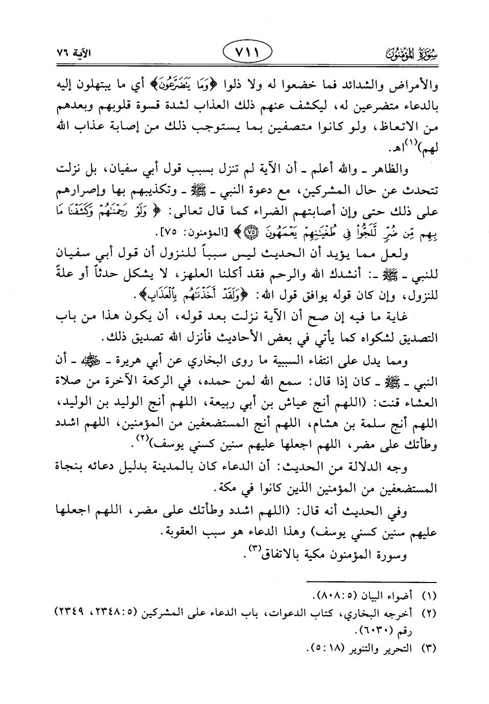 والظاهر - والله أعلم - أن الآية لم تنزل بسبب قول أبي سفيان، بل نزلت تتحدث عن حال المشركين، مع دعوة النبي - صَلَّى اللَّهُ عَلَيْهِ وَسَلَّمَ - وتكذيبهم بها وإصرارهم على ذلك حتى وإن أصابتهم الضراء كما قال تعالى: (وَلَوْ رَحِمْنَاهُمْ وَكَشَفْنَا مَا بِهِمْ مِنْ ضُرٍّ لَلَجُّوا فِي طُغْيَانِهِمْ يَعْمَهُونَ).