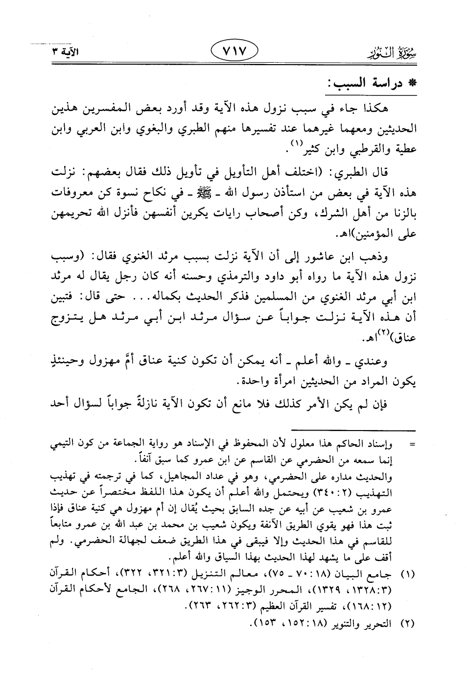 وذهب ابن عاشور إلى أن الآية نزلت بسبب مرثد الغنوي فقال: (وسبب نزول هذه الآية ما رواه أبو داود والترمذي وحسنه أنه كان رجل يقال له مرثد ابن أبي مرثد الغنوي من المسلمين فذكر الحديث بكماله ... حتى قال: فتبين أن هذه الآية نزلت جوابًا عن سؤال مرثد ابن أبي مرثد هل يتزوج عناق) اهـ.