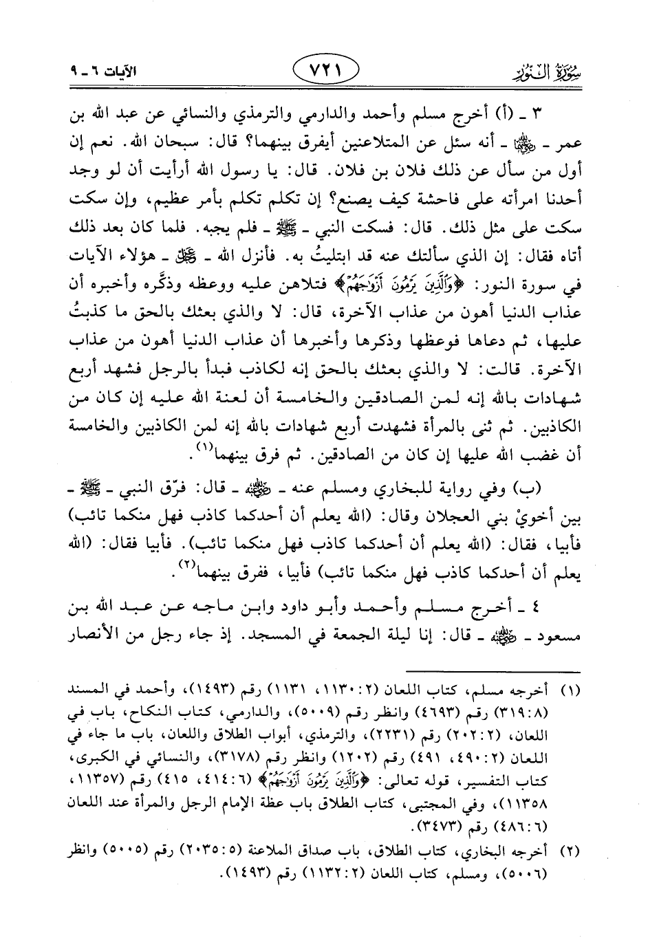 3 - (أ) أخرج مسلم وأحمد والدارمي والترمذي والنَّسَائِي عن عبد اللَّه بن عمر - رَضِيَ اللَّهُ عَنْهُمَا - أنه سئل عن المتلاعنين أيفرق بينهما؟ قال: سبحان اللَّه. نعم إن أول من سأل عن ذلك فلان بن فلان. قال: يا رسول اللَّه أرأيت أن لو وجد أحدنا امرأته على فاحشة كيف يصنع؟ إن تكلم تكلم بأمر عظيم، وإن سكت سكت على مثل ذلك. قال: فسكت النبي - صَلَّى اللَّهُ عَلَيْهِ وَسَلَّمَ - فلم يجبه. فلما كان بعد ذلك أتاه فقال: إن الذي سألتك عنه قد ابتليتُ به. فأنزل اللَّه - عَزَّ وَجَلَّ - هؤلاء الآيات في سورة النور: (وَالَّذِينَ يَرْمُونَ أَزْوَاجَهُمْ) فتلاهن عليه ووعظه وذكَّره وأخبره أن عذاب الدنيا أهون من عذاب الآخرة، قال: لا والذي بعثك بالحق ما كذبتُ عليها، ثم دعاها فوعظها وذكرها وأخبرها أن عذاب الدنيا أهون من عذاب الآخرة. قالت: لا والذي بعثك بالحق إنه لكاذب فبدأ بالرجل فشهد أربع شهادات باللَّه إنه لمن الصادقين والخامسة أن لعنة اللَّه عليه إن كان من الكاذبين. ثم ثنى بالمرأة فشهدت أربع شهادات باللَّه إنه لمن الكاذبين والخامسة أن غضب اللَّه عليها إن كان من الصادقين. ثم فرق بينهما.