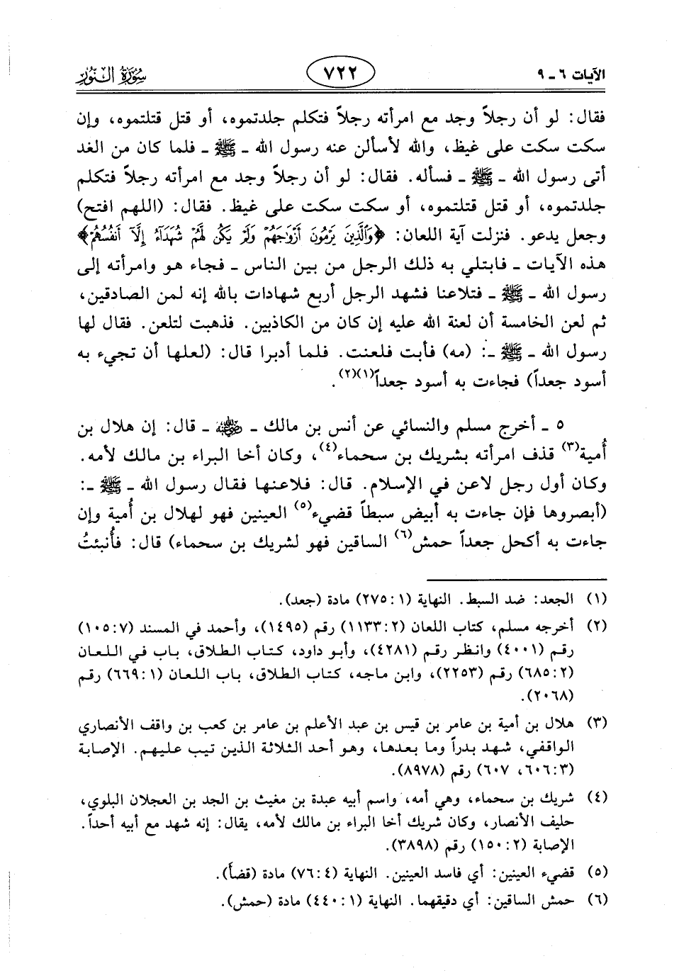 فقال: لو أن رجلاً وجد مع امرأته رجلاً فتكلم جلدتموه، أو قتل قتلتموه، وإن سكت سكت على غيظ، والله لأسألن عنه رسول الله - صَلَّى اللَّهُ عَلَيْهِ وَسَلَّمَ - فلما كان من الغد أتى رسول الله - صَلَّى اللَّهُ عَلَيْهِ وَسَلَّمَ - فسأله. فقال: لو أن رجلاً وجد مع امرأته رجلاً فتكلم جلدتموه، أو قتل قتلتموه، أو سكت سكت على غيظ. فقال: (اللهم افتح) وجعل يدعو. فنزلت آية اللعان: (وَالَّذِينَ يَرْمُونَ أَزْوَاجَهُمْ وَلَمْ يَكُنْ لَهُمْ شُهَدَاءُ إِلَّا أَنْفُسُهُمْ) هذه الآيات - فابتلي به ذلك الرجل من بين الناس - فجاء هو وامرأته إلى رسول الله - صَلَّى اللَّهُ عَلَيْهِ وَسَلَّمَ - فتلاعنا فشهد الرجل أربع شهادات باللَّه إنه لمن الصادقين، ثم لعن الخامسة أن لعنة الله عليه إن كان من الكاذبين. فذهبت لتلعن. فقال لها رسول اللَّه - صَلَّى اللَّهُ عَلَيْهِ وَسَلَّمَ -: (مه) فأبت فلعنت. فلما أدبرا قال: (لعلها أن تجيء به أسود جعداً) فجاءت به أسود جعداً.