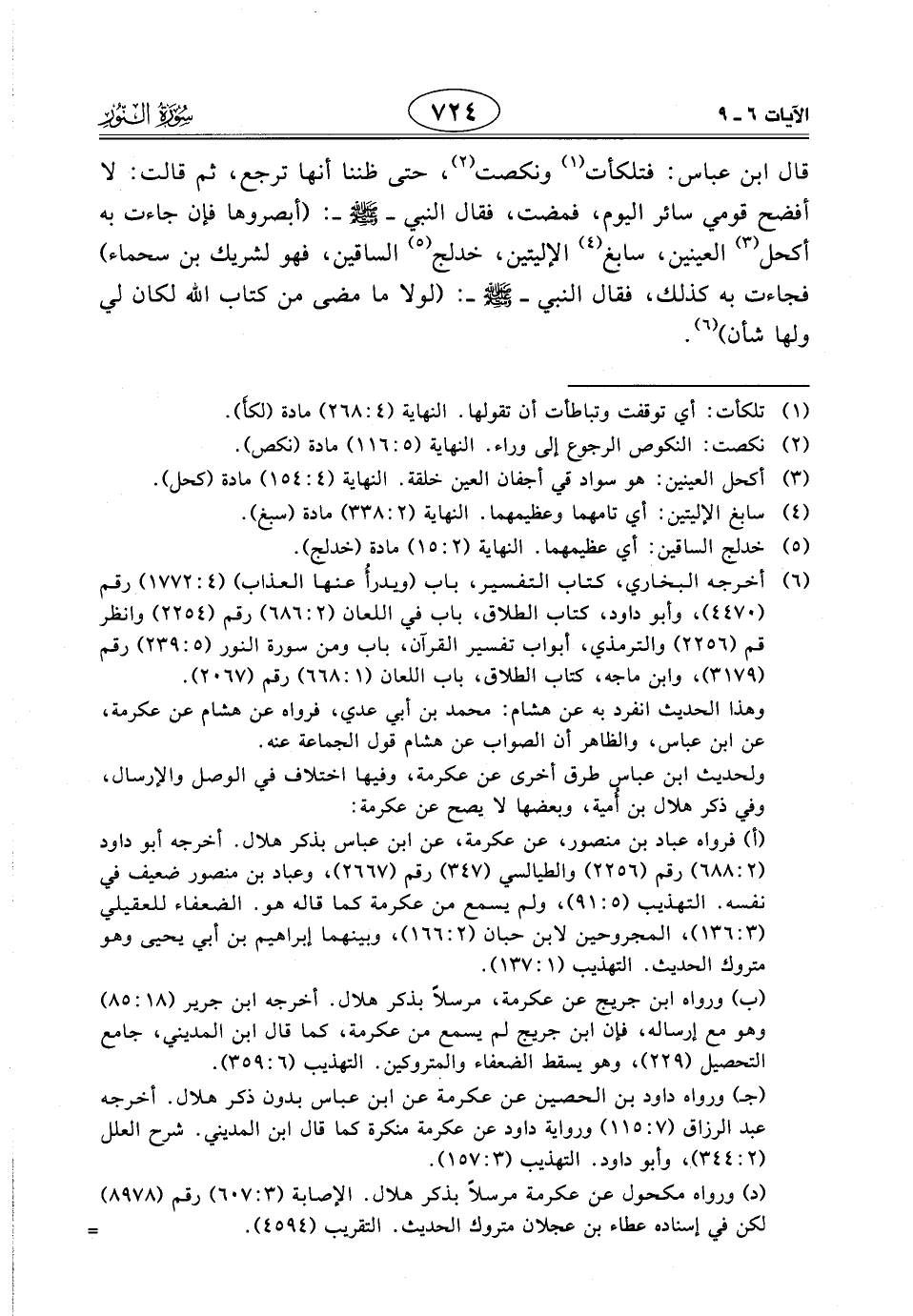قال ابن عبَّاسٍ: فتلكأت ونكصت، حتى ظننا أنها ترجع، ثم قالت: لا أفضح قومي سائر اليوم، فمضت، فقال النبي - صَلَّى اللَّهُ عَلَيْهِ وَسَلَّمَ -: (أبصروها فإن جاءت به أكحل العينين، سابغ الإليتين، خدلج الساقين، فهو لشريك بن سحماء) فجاءت به كذلك، فقال النبي - صَلَّى اللَّهُ عَلَيْهِ وَسَلَّمَ -: (لولا ما مضى من كتاب اللَّه لكان لي ولها شأن).