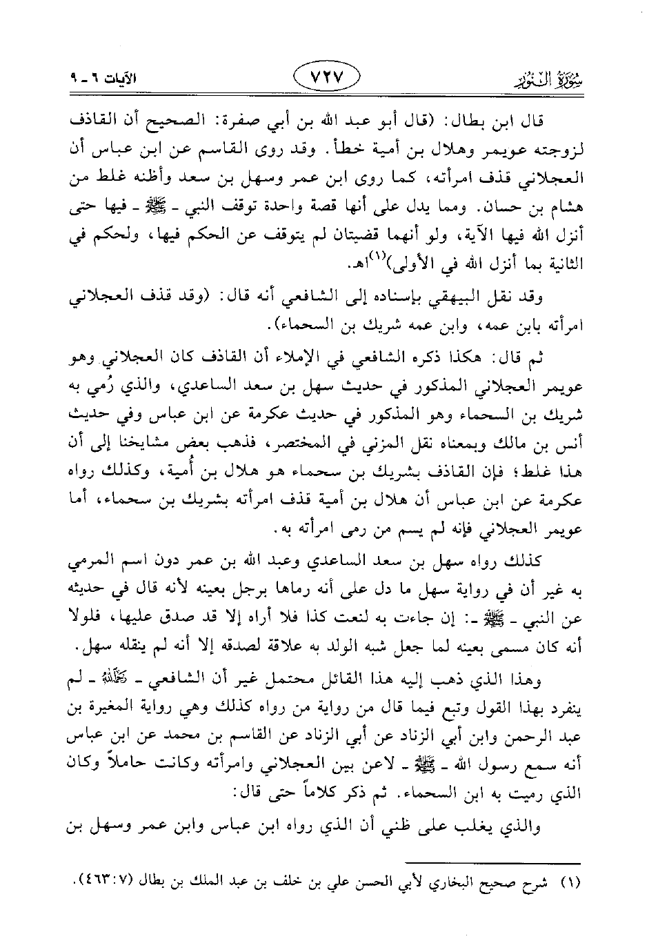 قال ابن بطال: (قال أْبو عبد الله بن أبي صفرة: الصحيح أن القاذف لزوجته عويمر وهلال بن أمية خطأ. وقد روى القاسم عن ابن عبَّاسٍ أن العجلاني قذف امرأته، كما روى ابن عمر وسهل بن سعد وأظنه غلط من هشام بن حسان. ومما يدل على أنها قصة واحدة توقف النبي - صَلَّى اللَّهُ عَلَيْهِ وَسَلَّمَ - فيها حتى أنزل اللَّه فيها الآية، ولو أنهما قضيتان لم يتوقف عن الحكم فيها، ولحكم في الثانية بما أنزل اللَّه في الأولى) اهـ