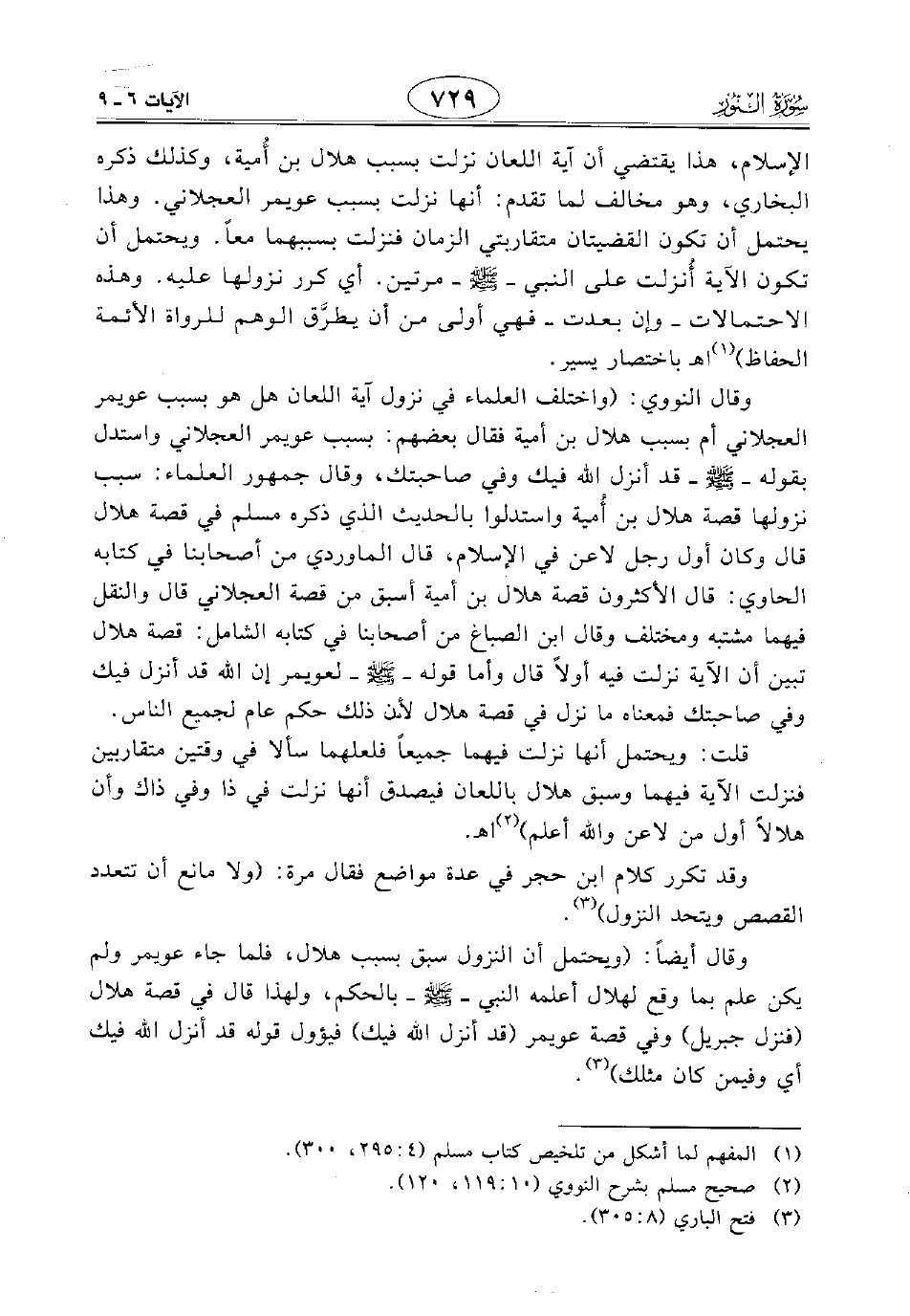 الإسلام، هذا يقتضي أن آية اللعان نزلت بسبب هلال بن أُمية، وكذلك ذكره البخاري، وهو مخالف لما تقدم: أنها نزلت بسبب عويمر العجلاني. وهذا يحتمل أن تكون القضيتان متقاربتي الزمان فنزلت بسببهما معاً. ويحتمل أن تكون الآية أُنزلت على النبي - صَلَّى اللَّهُ عَلَيْهِ وَسَلَّمَ - مرتين. أي كرر نزولها عليه - وهذه الاحتمالات - وإن بعدت - فهي أولى من أن يطرَّق الوهم للرواة الأئمة الحفاظ) اهـ باختصار يسير.