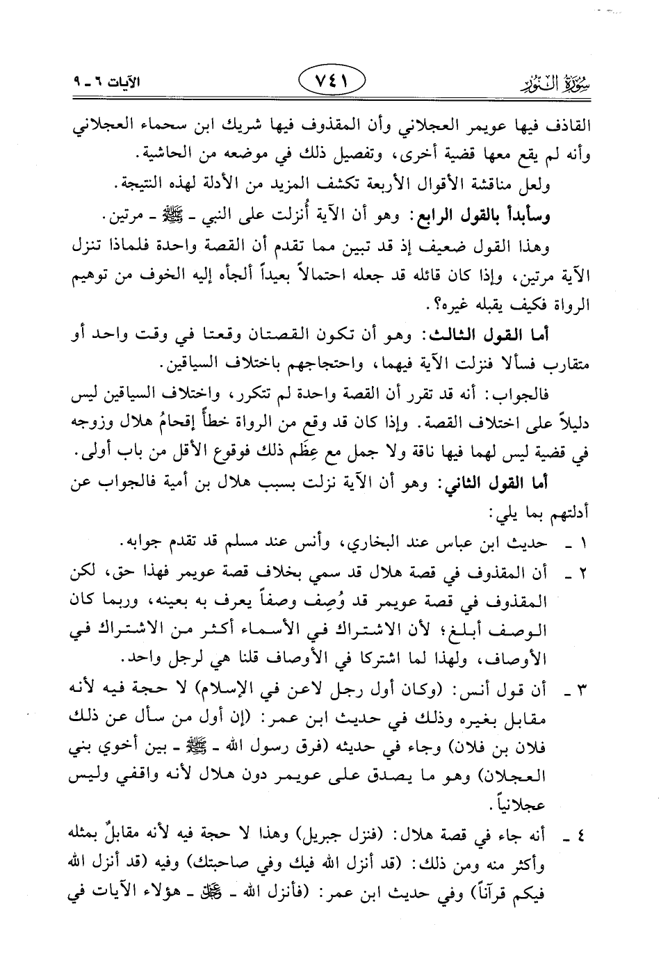 4 - أنه جاء في قصة هلال: (فنزل جبريل) وهذا لا حجة فيه لأنه مقابلٌ بمثله وأكثر منه ومن ذلك: (قد أنزل اللَّه فيك وفي صاحبتك) وفيه (قد أنزل اللَّه فيكم قرآناً) وفي حديث ابن عمر: (فأنزل الله - عَزَّ وَجَلَّ - هؤلاء الآيات في