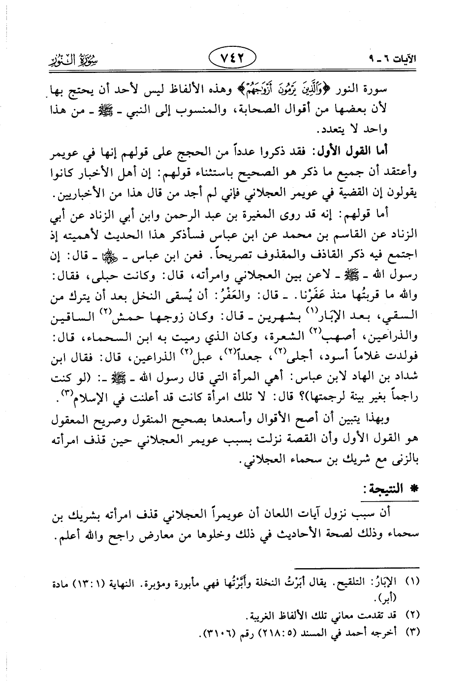 وبهذا يتبين أن أصح الأقوال وأسعدها بصحيح المنقول وصريح المعقول هو القول الأول وأن القصة نزلت بسبب عويمر العجلانى حين قذف امرأته بالزنى مع شريك بن سحماء العجلاني.