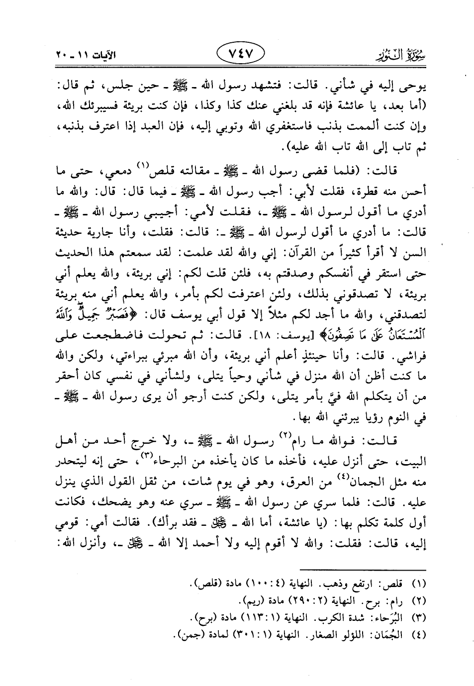 قالت: (فلما قضى رسول الله - صَلَّى اللَّهُ عَلَيْهِ وَسَلَّمَ - مقالته قلص دمعي، حتى ما أحسن منه قطرة، فقلت لأبي: أجب رسول اللَّه - صَلَّى اللَّهُ عَلَيْهِ وَسَلَّمَ - فيما قال: قال: والله ما أدري ما أقول لرسول الله - صَلَّى اللَّهُ عَلَيْهِ وَسَلَّمَ -، فقلت لأمي: أجيبي رسول اللَّه - صَلَّى اللَّهُ عَلَيْهِ وَسَلَّمَ - قالت: ما أدري ما أقول لرسول اللَّه - صَلَّى اللَّهُ عَلَيْهِ وَسَلَّمَ -: قالت: فقلت، وأنا جارية حديثة السن لا أقرأ كثيراً من القرآن: إني واللَّه لقد علمت: لقد سمعتم هذا الحديث حتى استقر في أنفسكم وصدقتم به، فلئن قلت لكم: إني بريئة، واللَّه يعلم أني بريئة، لا تصدقوني بذلك، ولئن اعترفت لكم بأمر، واللَّه يعلم أني منه بريئة لتصدقني، واللَّه ما أجد لكم مثلاً إلا قول أبي يوسف قال: فَصَبْرٌ جَمِيلٌ وَاللَّهُ الْمُسْتَعَانُ عَلَى مَا تَصِفُونَ). قالت: ثم تحولت فاضطجعت على فراشي. قالت: وأنا حينئذٍ أعلم أني بريئة، وأن اللَّه مبرئي ببراءتي، ولكن واللَّه ما كنت أظن أن اللَّه منزل في شأني وحيًا يتلى، ولشأني في نفسي كان أحقر من أن يتكلم اللَّه فيَّ بأمر يُتلى، ولكن كنت أرجو أن يرى رسول اللَّه - صَلَّى اللَّهُ عَلَيْهِ وَسَلَّمَ - في النوم رؤيا يبرئني اللَّه بها.
