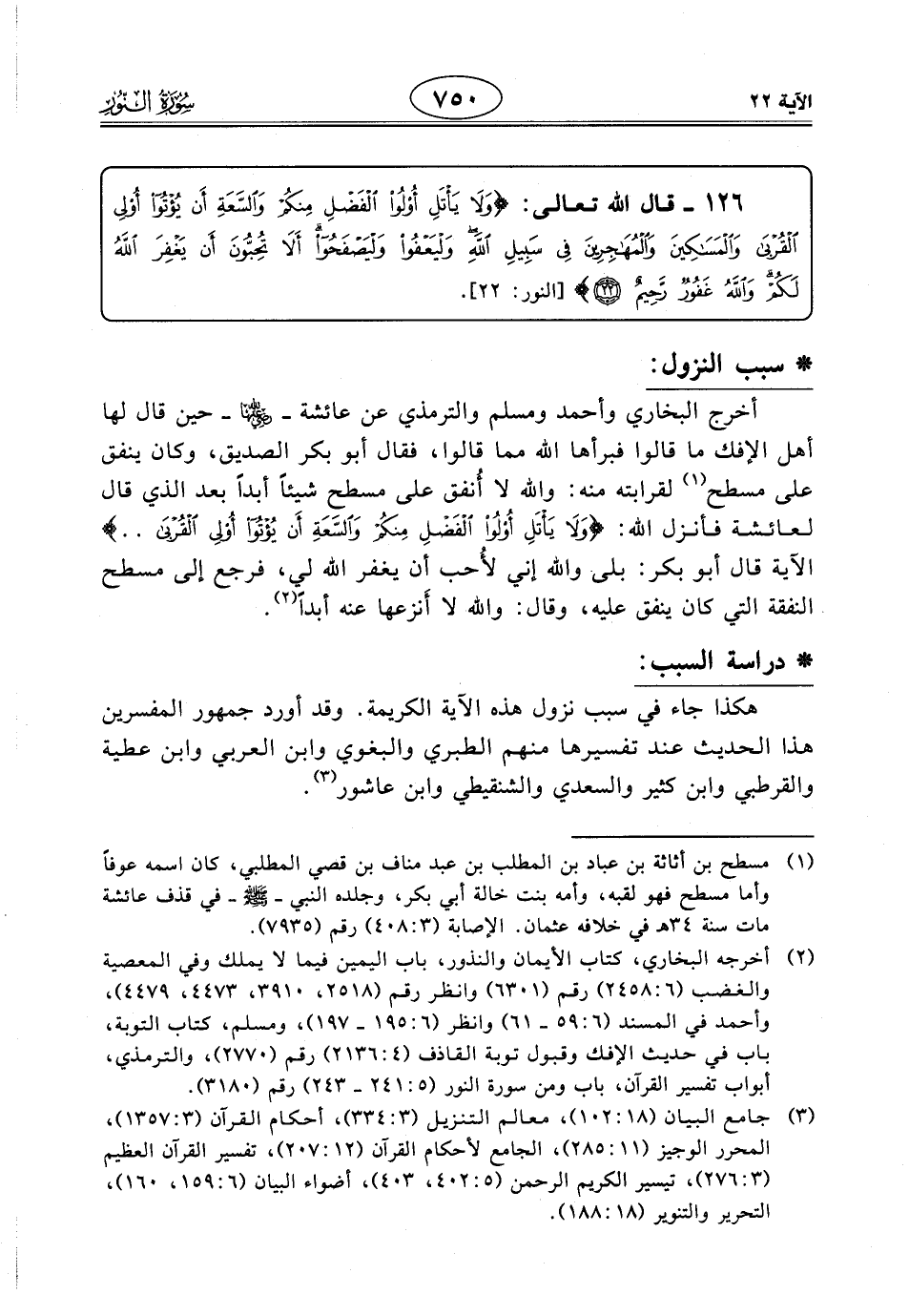 126 - قال اللَّه تعالى: (وَلَا يَأْتَلِ أُولُو الْفَضْلِ مِنْكُمْ وَالسَّعَةِ أَنْ يُؤْتُوا أُولِي الْقُرْبَى وَالْمَسَاكِينَ وَالْمُهَاجِرِينَ فِي سَبِيلِ اللَّهِ وَلْيَعْفُوا وَلْيَصْفَحُوا أَلَا تُحِبُّونَ أَنْ يَغْفِرَ اللَّهُ لَكُمْ وَاللَّهُ غَفُورٌ رَحِيمٌ (22)