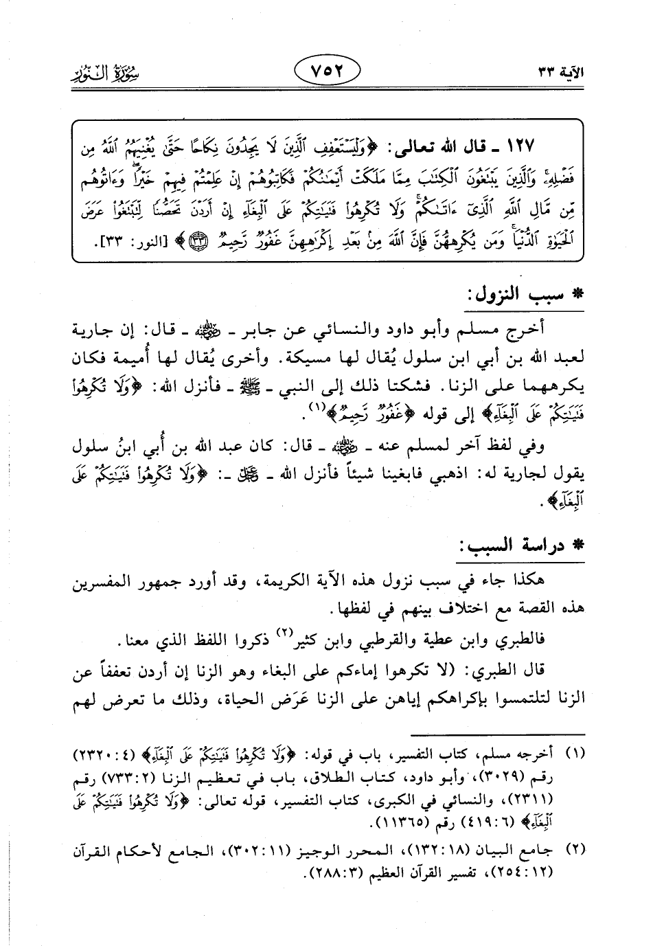 127 - قال الله تعالى: (وَلْيَسْتَعْفِفِ الَّذِينَ لَا يَجِدُونَ نِكَاحًا حَتَّى يُغْنِيَهُمُ اللَّهُ مِنْ فَضْلِهِ وَالَّذِينَ يَبْتَغُونَ الْكِتَابَ مِمَّا مَلَكَتْ أَيْمَانُكُمْ فَكَاتِبُوهُمْ إِنْ عَلِمْتُمْ فِيهِمْ خَيْرًا وَآتُوهُمْ مِنْ مَالِ اللَّهِ الَّذِي آتَاكُمْ وَلَا تُكْرِهُوا فَتَيَاتِكُمْ عَلَى الْبِغَاءِ إِنْ أَرَدْنَ تَحَصُّنًا لِتَبْتَغُوا عَرَضَ الْحَيَاةِ الدُّنْيَا وَمَنْ يُكْرِهْهُنَّ فَإِنَّ اللَّهَ مِنْ بَعْدِ إِكْرَاهِهِنَّ غَفُورٌ رَحِيمٌ (33)
