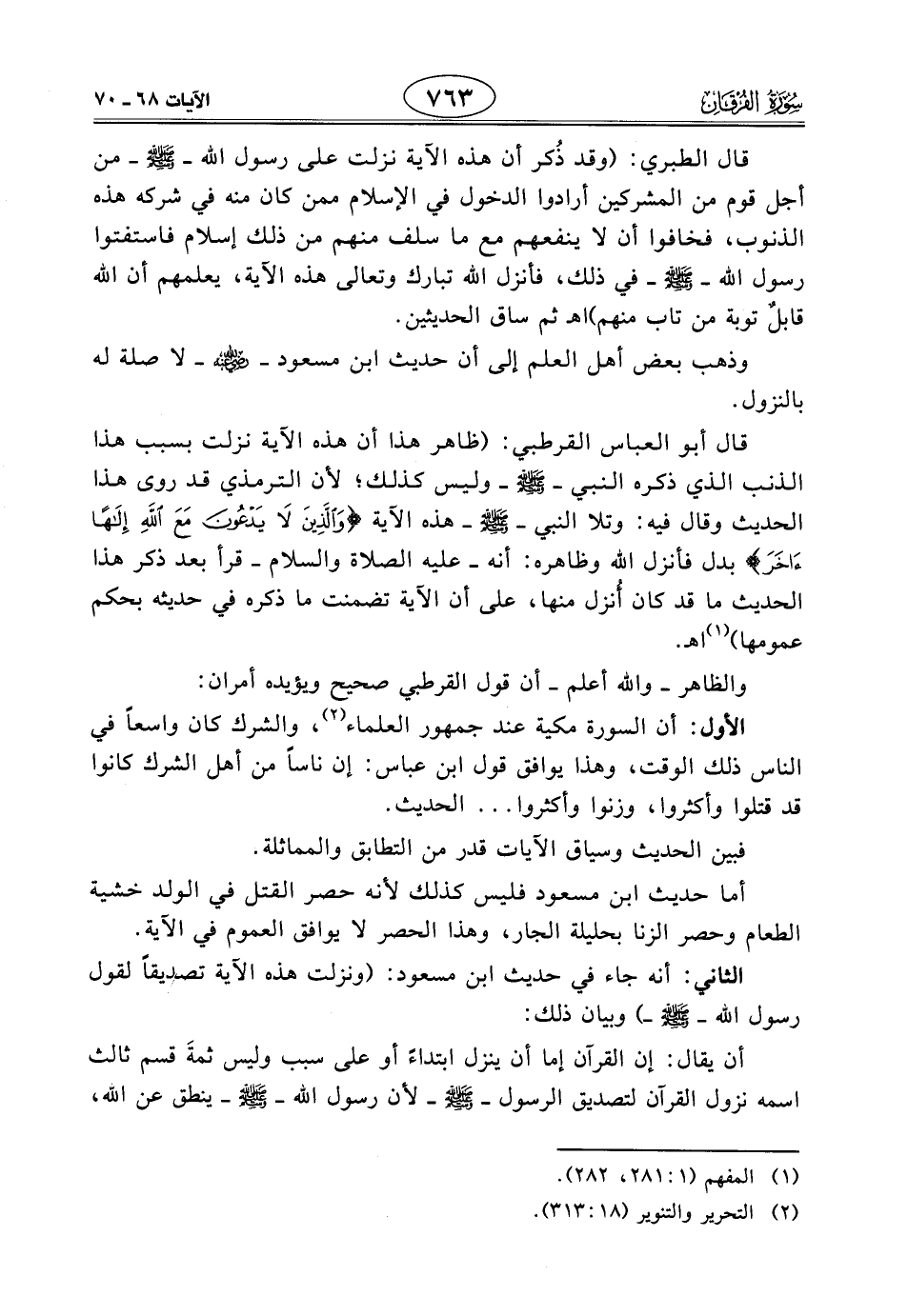 قال أبو العباس القرطبي: (ظاهر هذا أن هذه الآية نزلت بسبب هذا الذنب الذي ذكره النبي - صَلَّى اللَّهُ عَلَيْهِ وَسَلَّمَ - وليس كذلك؛ لأن الترمذي قد روى هذا الحديث وقال فيه: وتلا النبي - صَلَّى اللَّهُ عَلَيْهِ وَسَلَّمَ - هذه الآية (وَالَّذِينَ لَا يَدْعُونَ مَعَ اللَّهِ إِلَهًا آخَرَ) بدل فأنزل اللَّه وظاهره: أنه - عليه الصلاة والسلام - قرأ بعد ذكر هذا الحديث ما قد كان أُنزل منها، على أن الآية تضمنت ما ذكره في حديثه بحكم عمومها) اهـ.