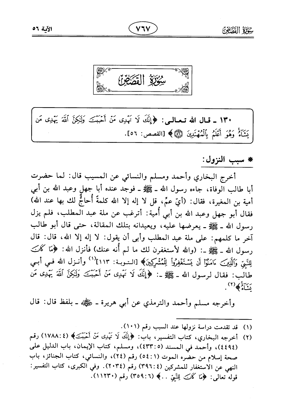 130 - قال الله تعالى: (إِنَّكَ لَا تَهْدِي مَنْ أَحْبَبْتَ وَلَكِنَّ اللَّهَ يَهْدِي مَنْ يَشَاءُ وَهُوَ أَعْلَمُ بِالْمُهْتَدِينَ (56)