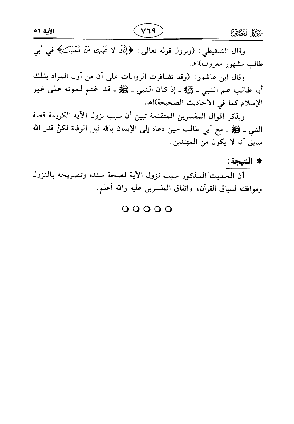 وبذكر أقوال المفسرين المتقدمة تبين أن سبب نزول الآية الكريمة قصة النبي - صَلَّى اللَّهُ عَلَيْهِ وَسَلَّمَ - مع أبي طالب حين دعاه إلى الإيمان باللَّه قبل الوفاة لكنَّ قدر الله سابق أنه لا يكون من المهتدين.