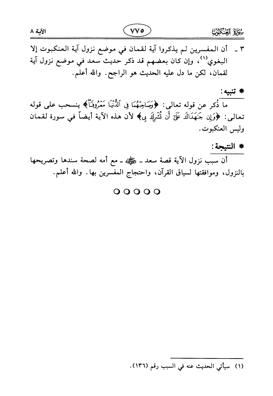 3 - أن المفسرين لم يذكروا آية لقمان في موضع نزول آية العنكبوت إلا البغوي، وإن كان بعضهم قد ذكر حديث سعد في موضع نزول آية لقمان، لكن ما دلّ عليه الحديث هو الراجح. والله أعلم.