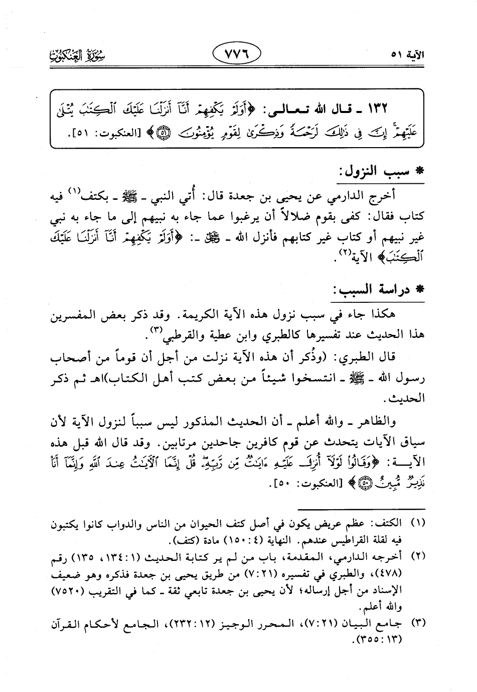 132 - قال الله تعالى: (أَوَلَمْ يَكْفِهِمْ أَنَّا أَنْزَلْنَا عَلَيْكَ الْكِتَابَ يُتْلَى عَلَيْهِمْ إِنَّ فِي ذَلِكَ لَرَحْمَةً وَذِكْرَى لِقَوْمٍ يُؤْمِنُونَ (51)