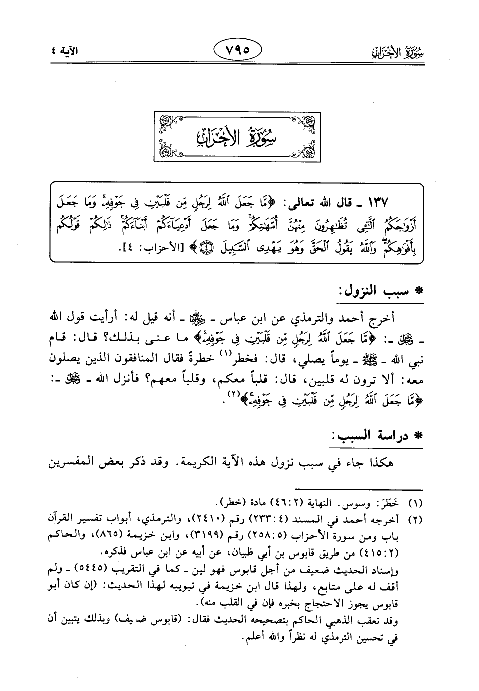 أخرج أحمد والترمذي عن ابن عبَّاسٍ - رضي الله عنه - أنه قيل له: أرأيت قول اللَّه - عَزَّ وَجَلَّ -: (مَا جَعَلَ اللَّهُ لِرَجُلٍ مِنْ قَلْبَيْنِ فِي جَوْفِهِ) ما عنى بذلك؟ قال: قام نبي الله - صَلَّى اللَّهُ عَلَيْهِ وَسَلَّمَ - يوماً يصلي، قال: فخطر خطرةً فقال المنافقون الذين يصلون معه: ألا ترون له قلبين، قال: قلباً معكم، وقلبًا معهم؟ فأنزل اللَّه - عَزَّ وَجَلَّ -: (مَا جَعَلَ اللَّهُ لِرَجُلٍ مِنْ قَلْبَيْنِ فِي جَوْفِهِ).