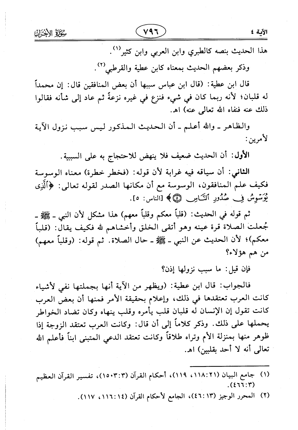 قال ابن عطية: (قال ابن عبَّاسٍ سببها أن بعض المنافقين قال: إن محمداً له قلبان؛ لأنه ربما كان في شيء فنزع في غيره نزعةً ثم عاد إلى شأنه فقالوا ذلك عنه فنفاه اللَّه تعالى عنه) اهـ.